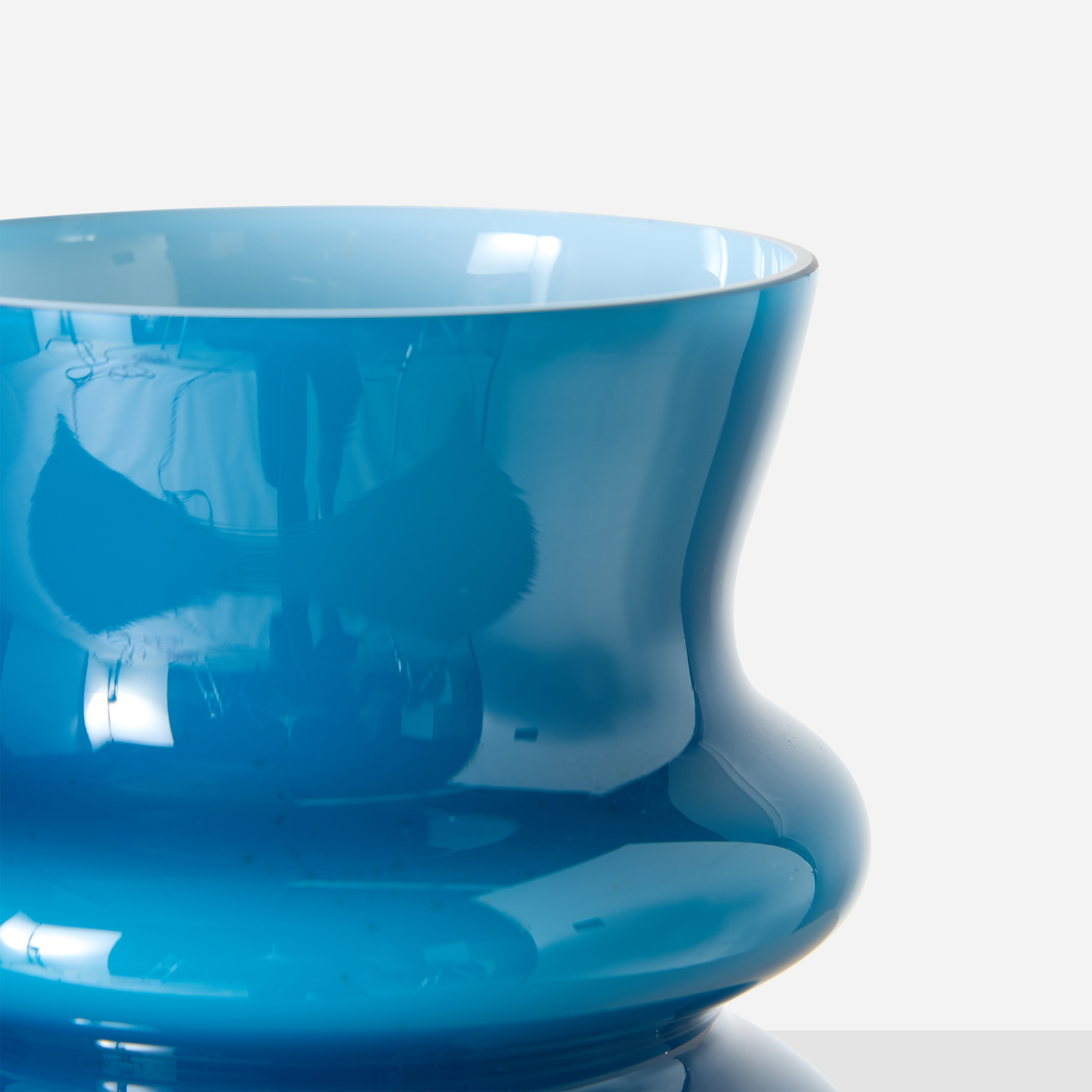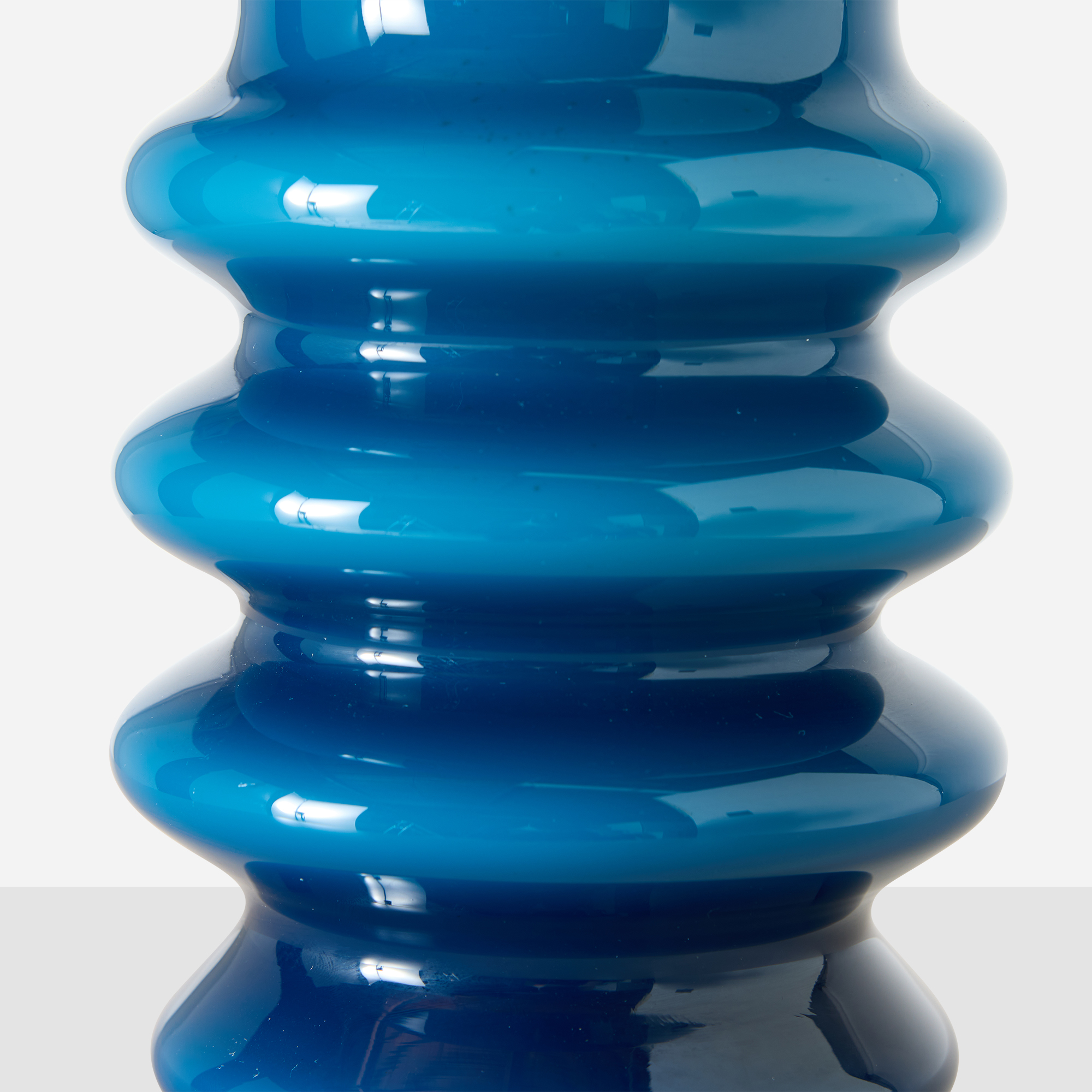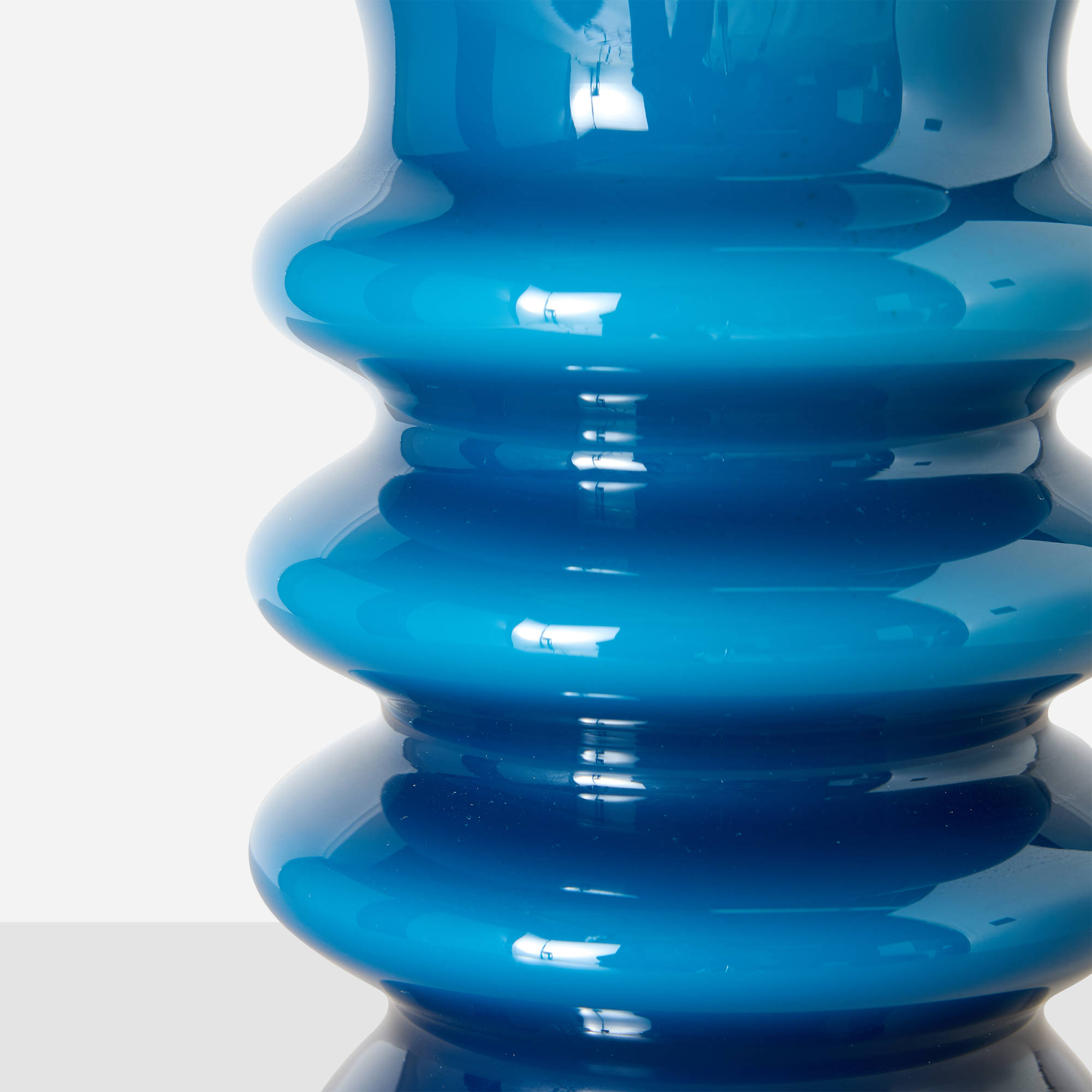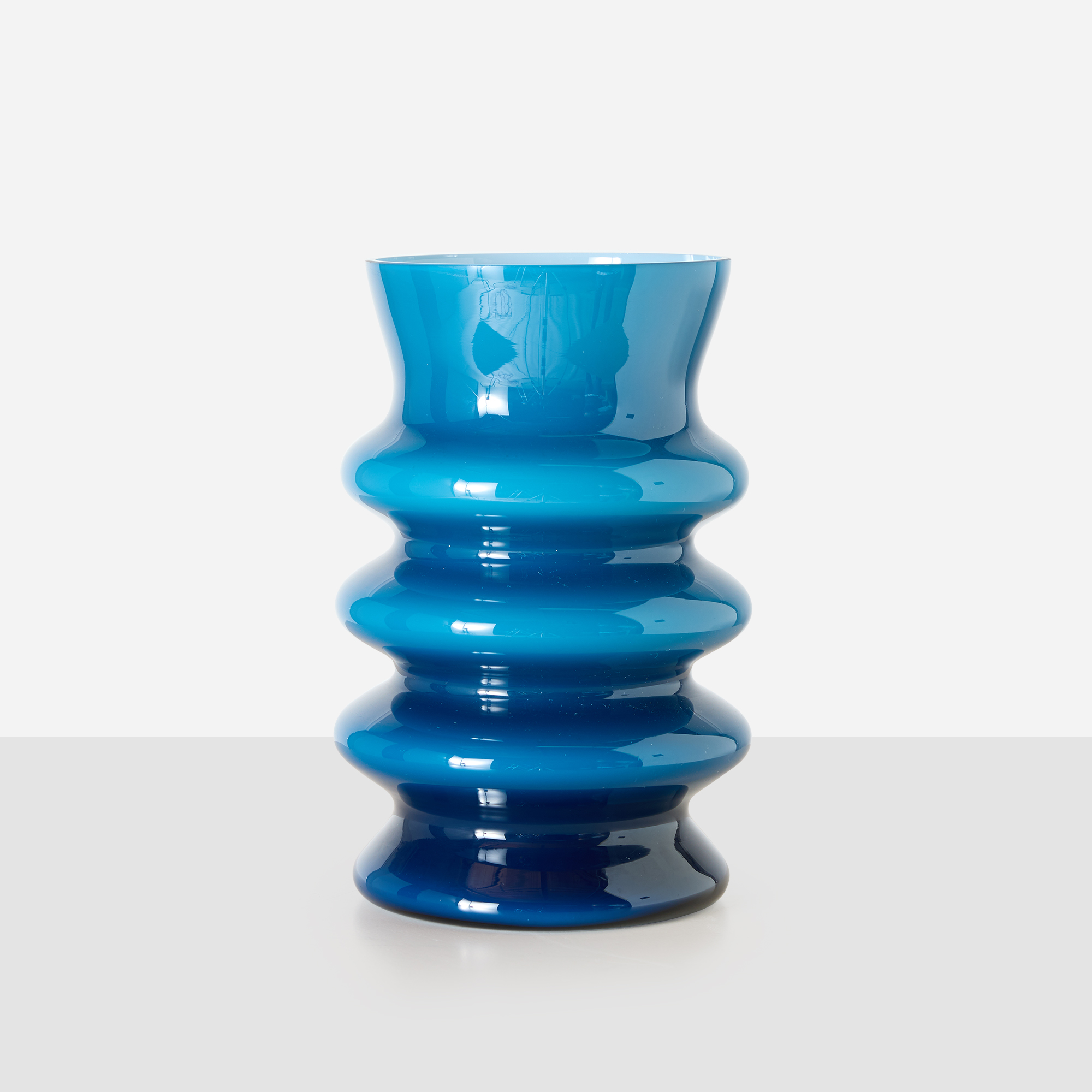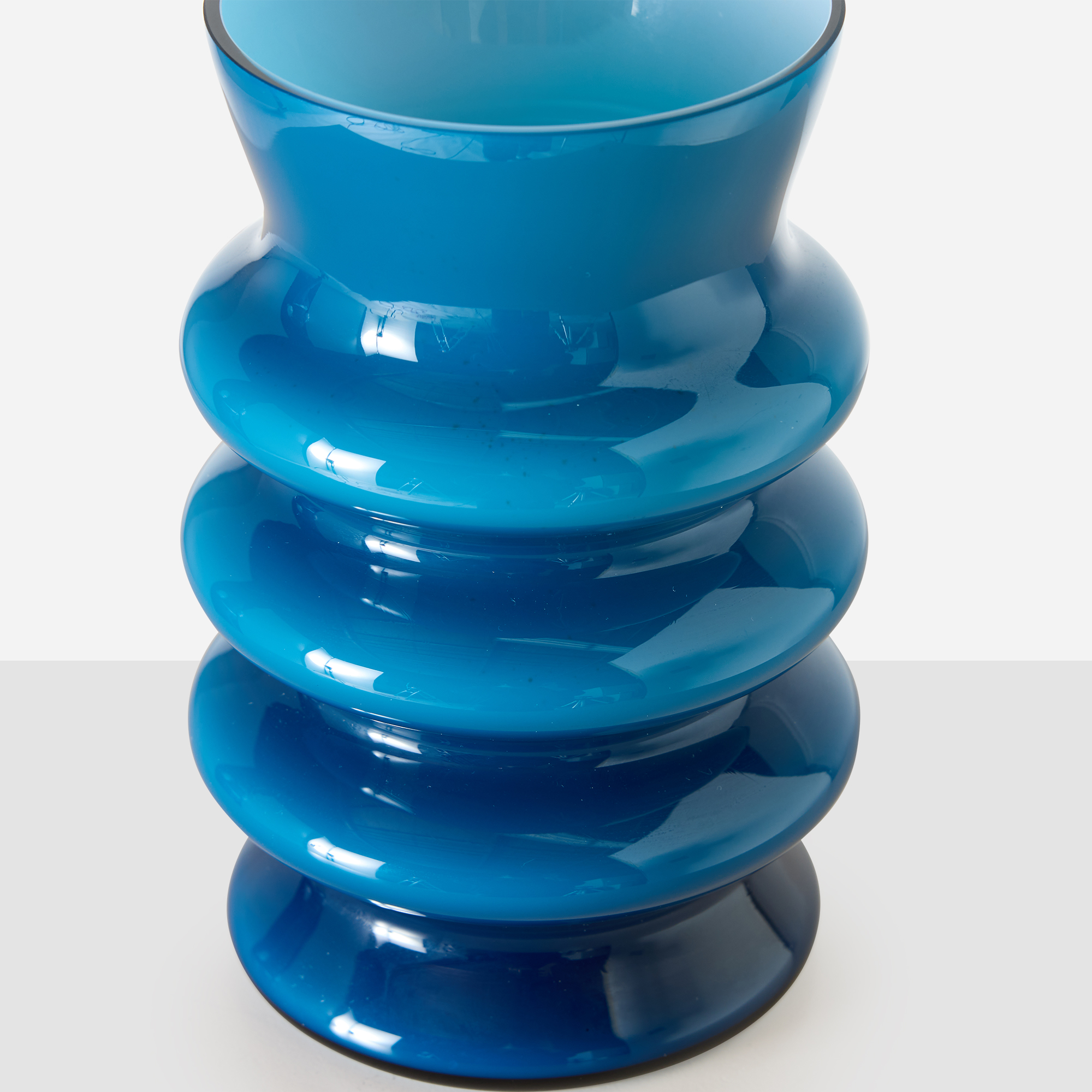 A vase in deep cerulean blue glass with a ribbed body and flared mouth. Produced by Alsterfors of Sweden.