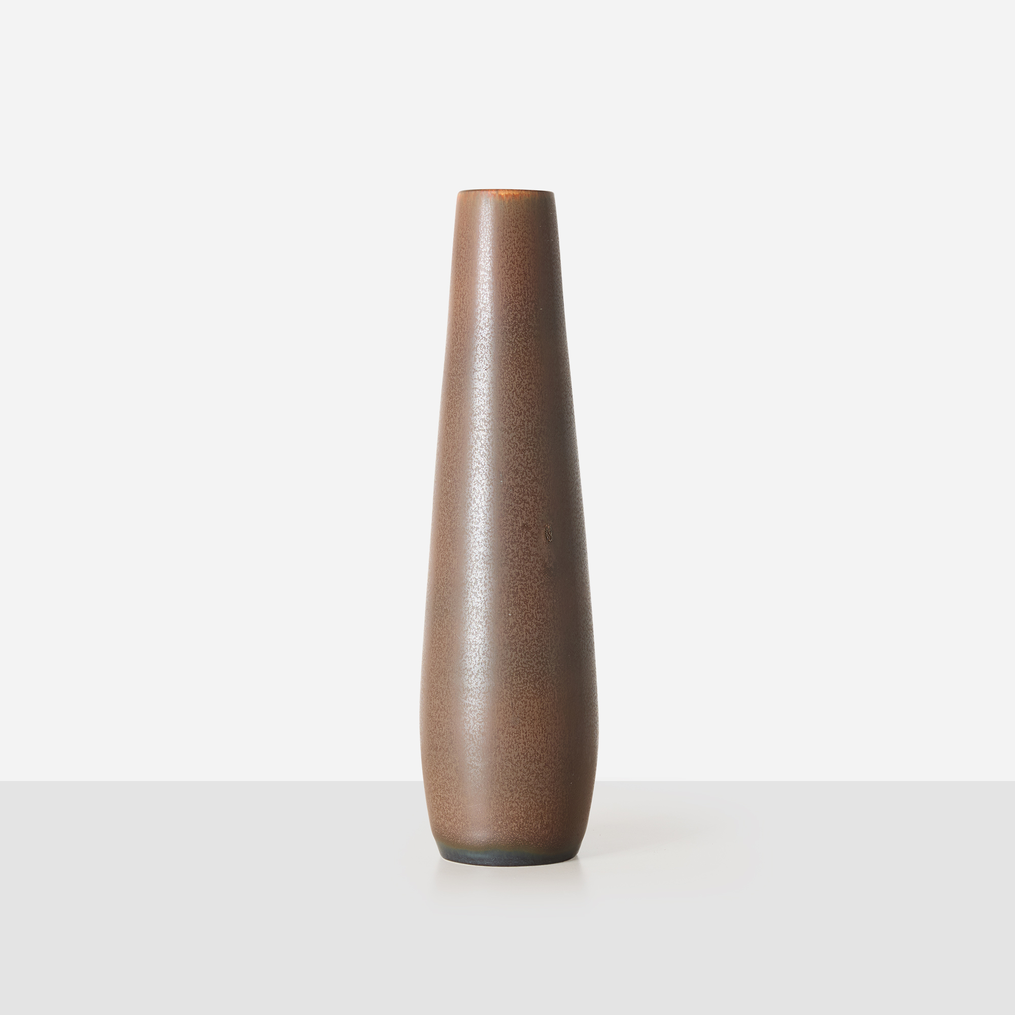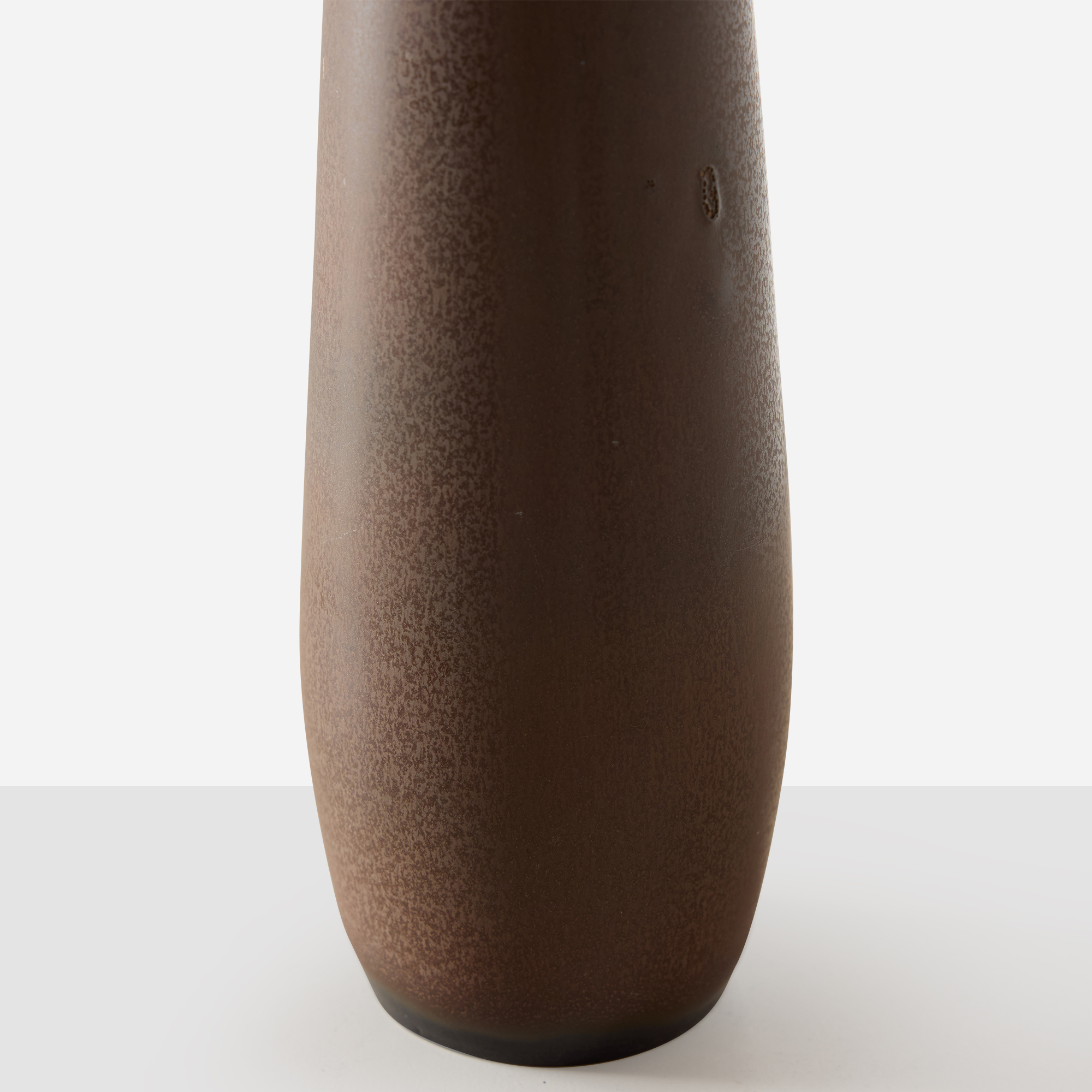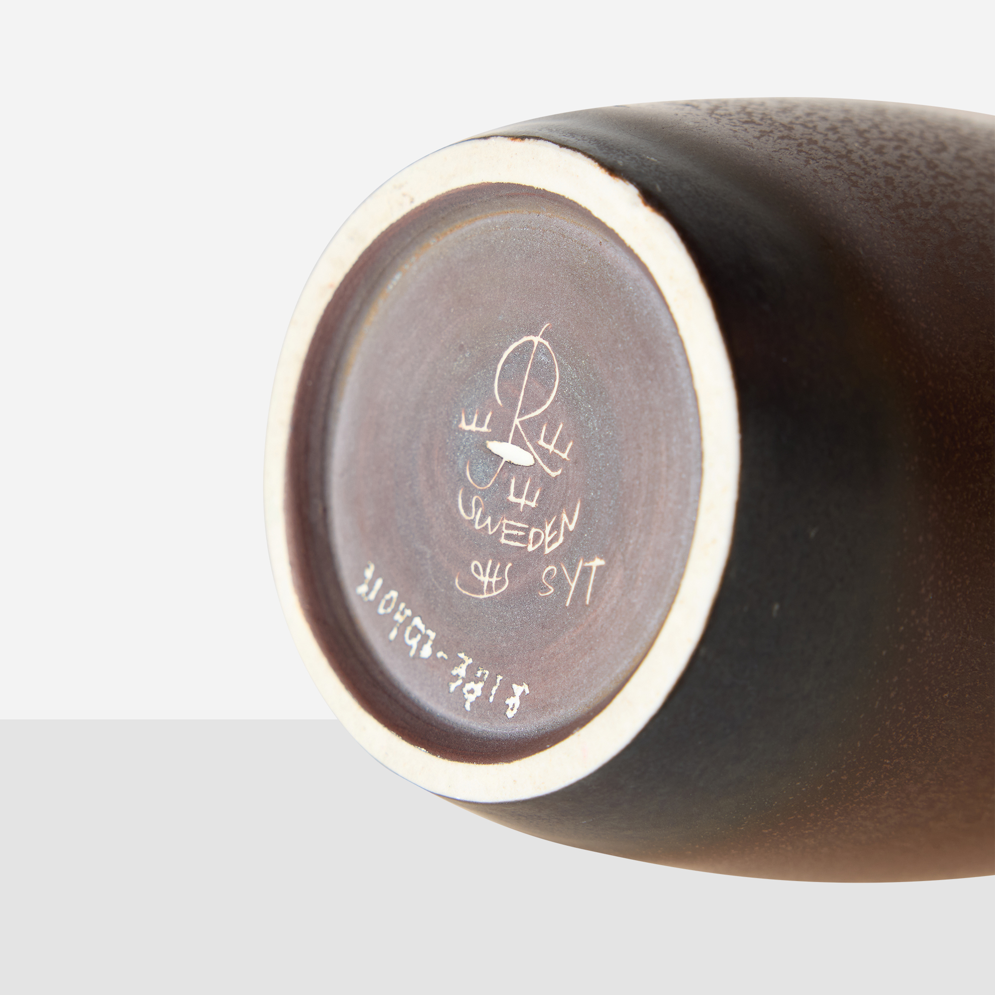 Tall ceramic vase in deeps browns for Rörstrand, the diameter tapering from a narroww 1.75″ opening to 2.5″ base. Model SYT. Marked on base.