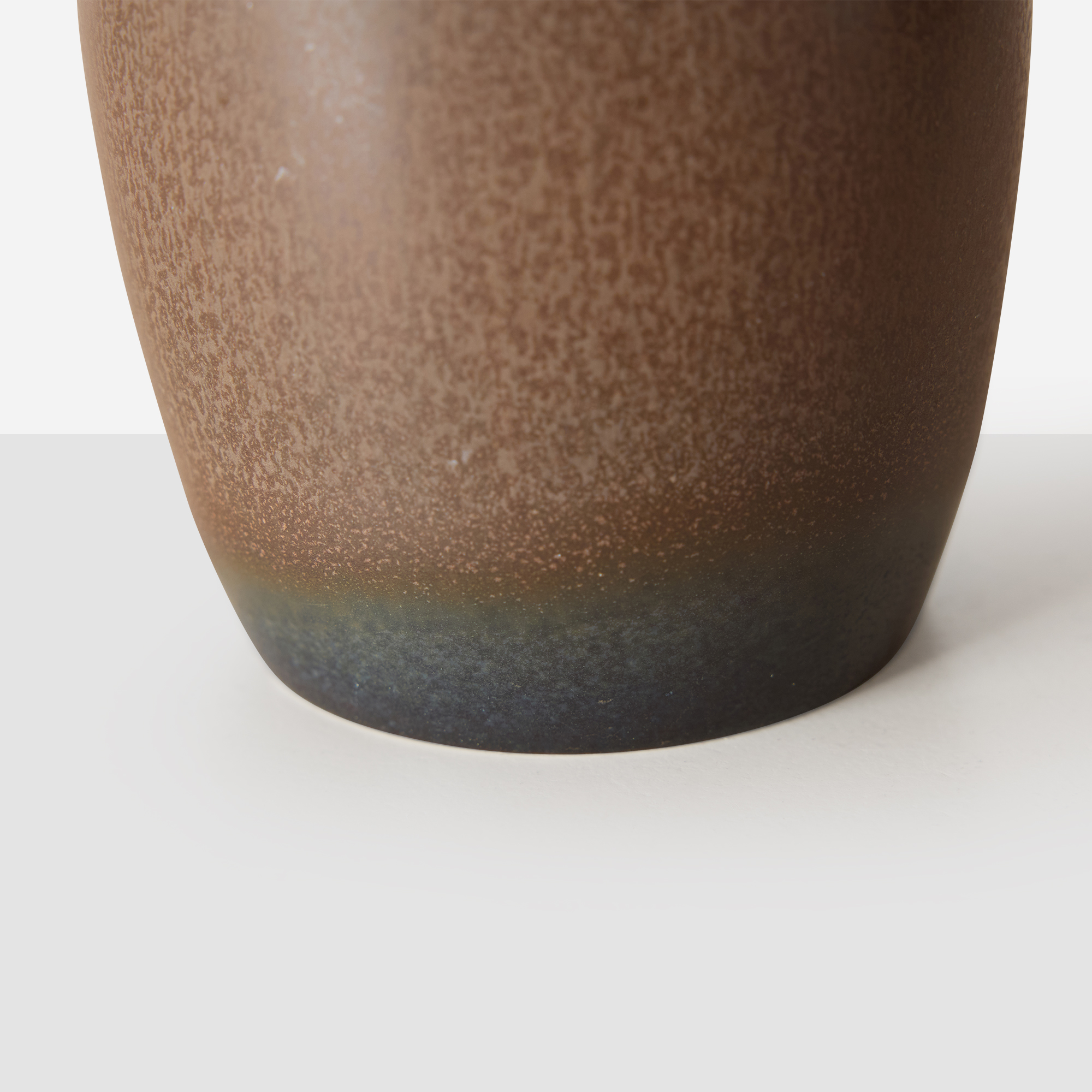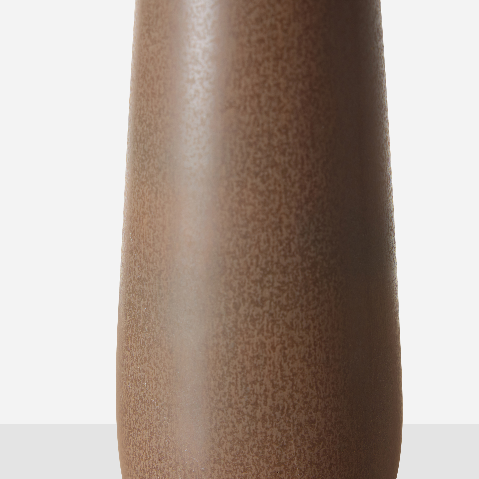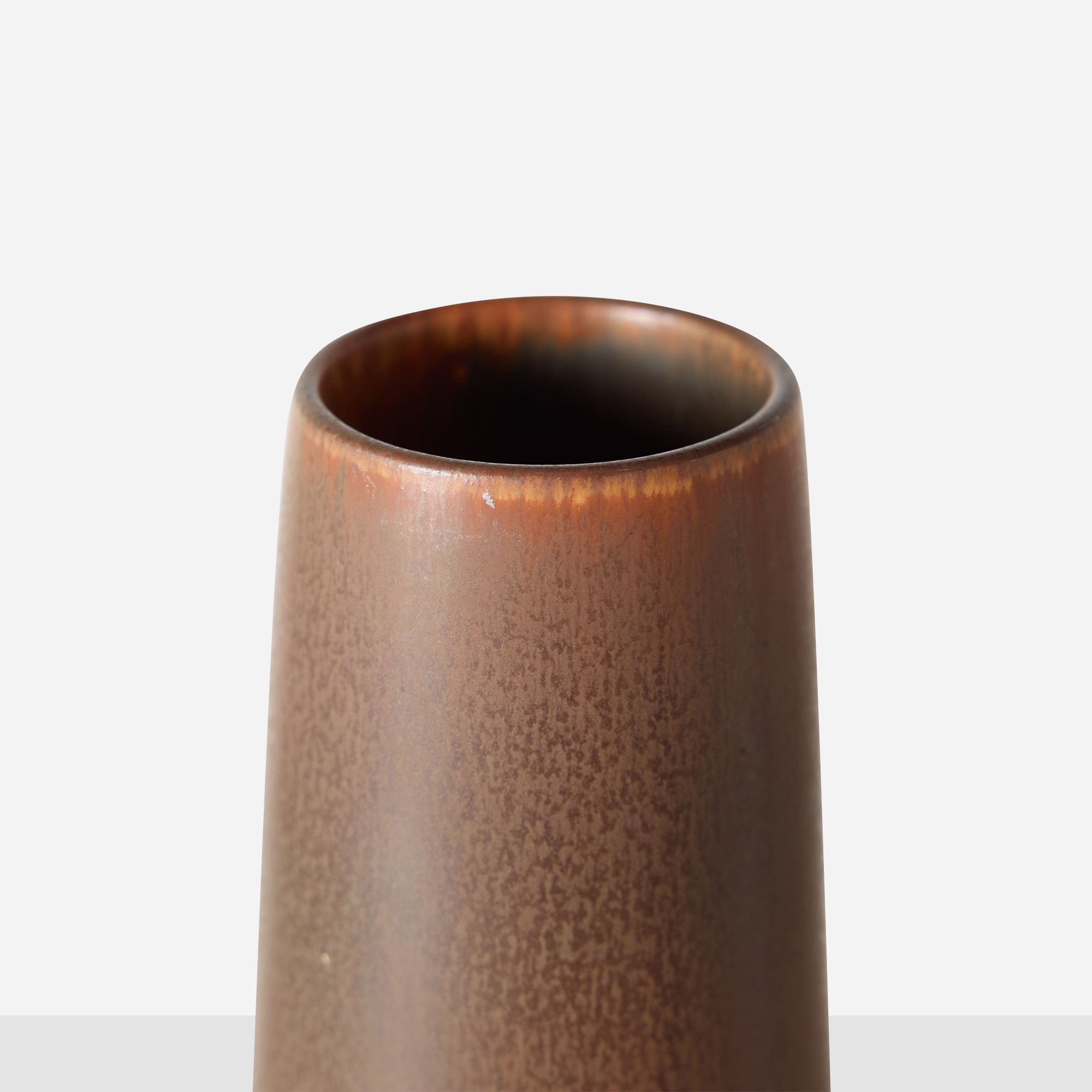 Tall ceramic vase in deeps browns for Rörstrand, the diameter tapering from a narroww 1.75″ opening to 2.5″ base. Model SYT. Marked on base.