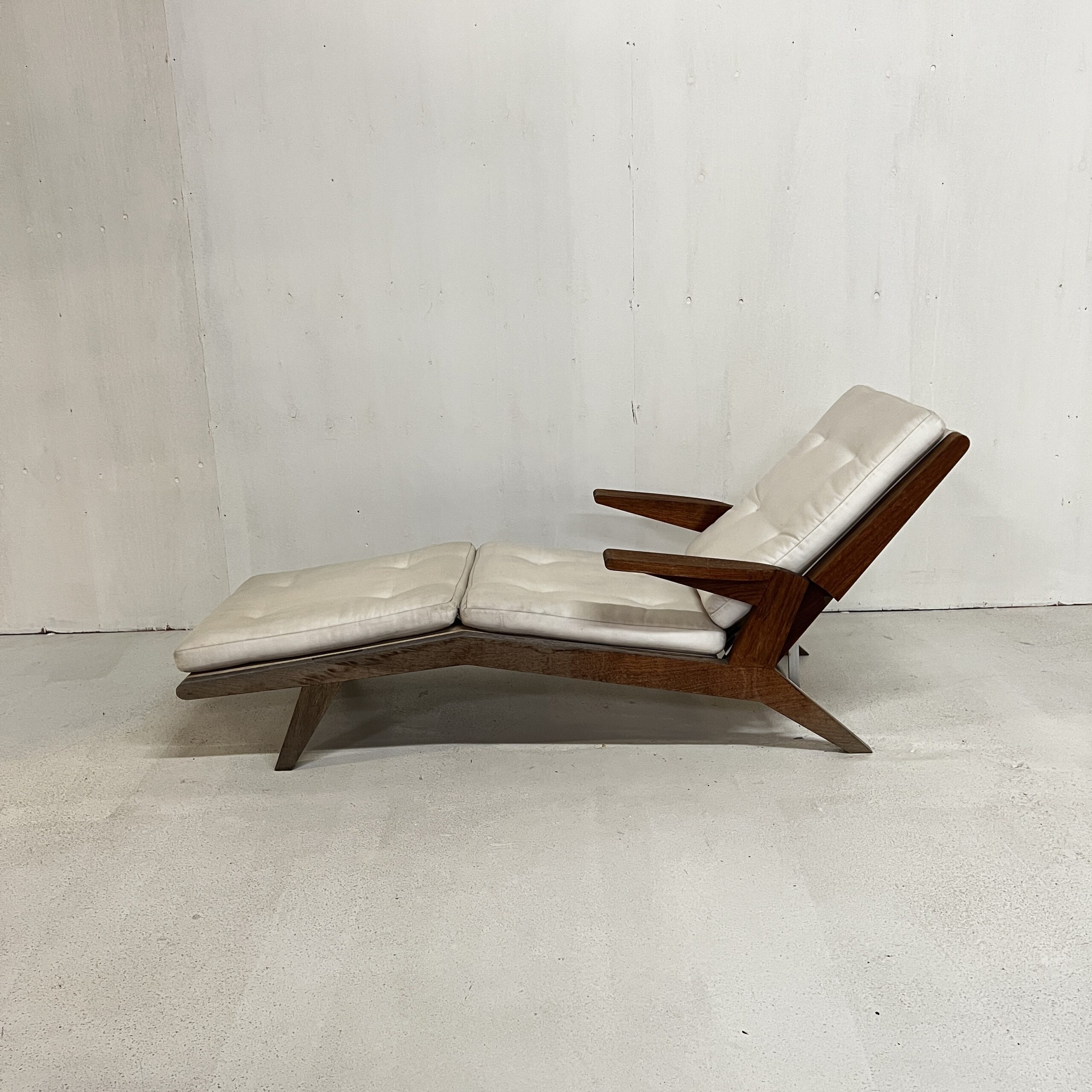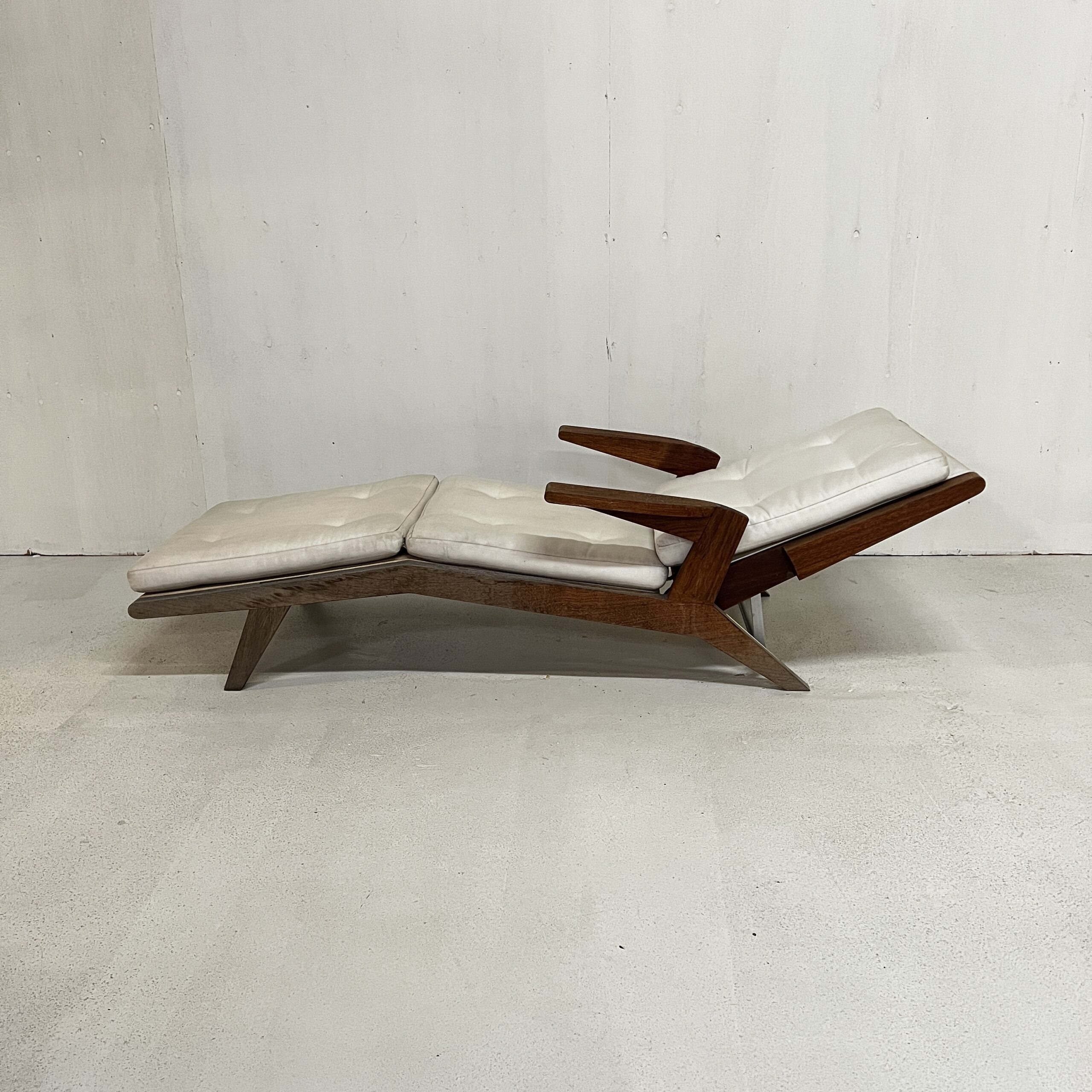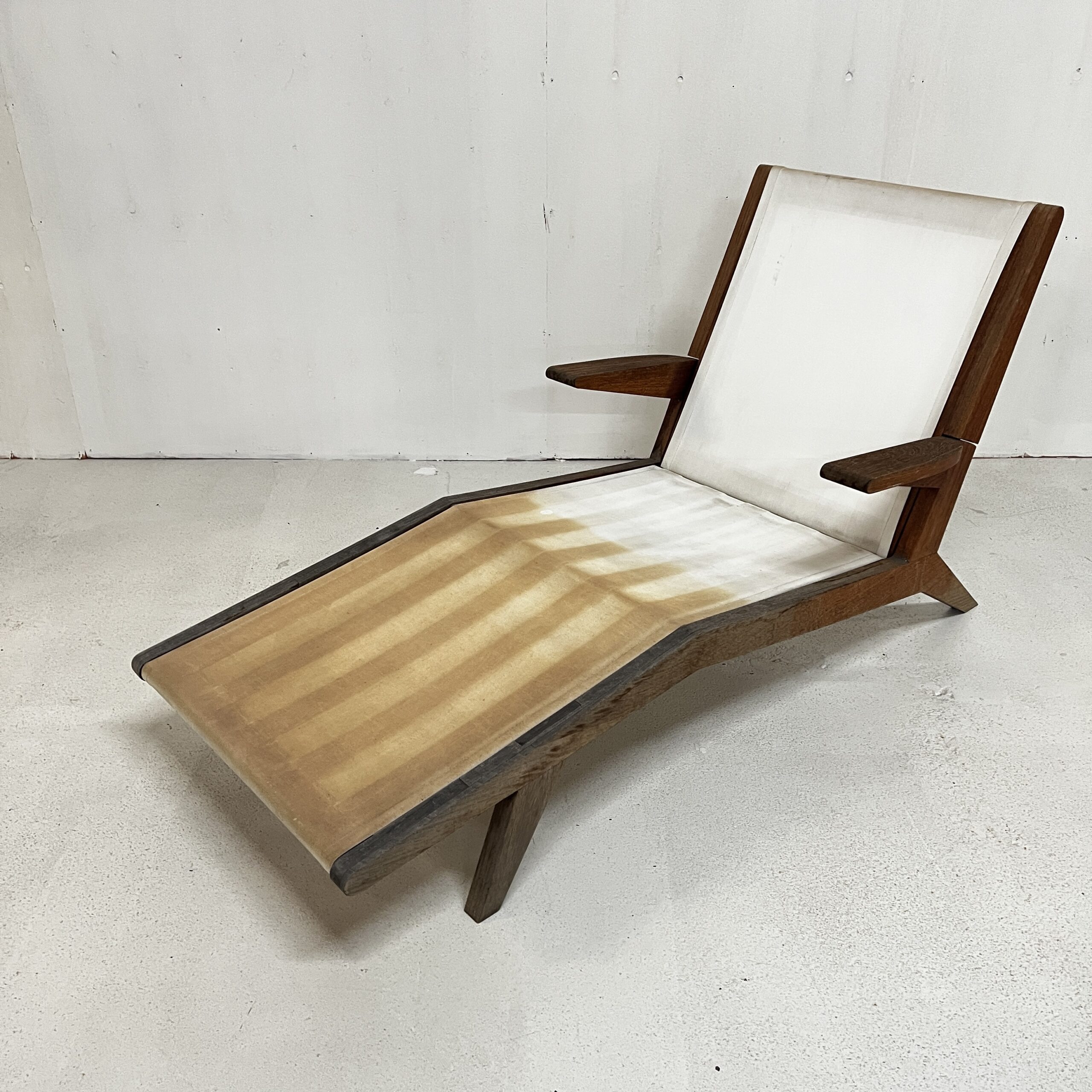 An open-arm lounge chair with 4 adjustable seat back heights. Previously used in our gallery, staged indoors and outdoors.