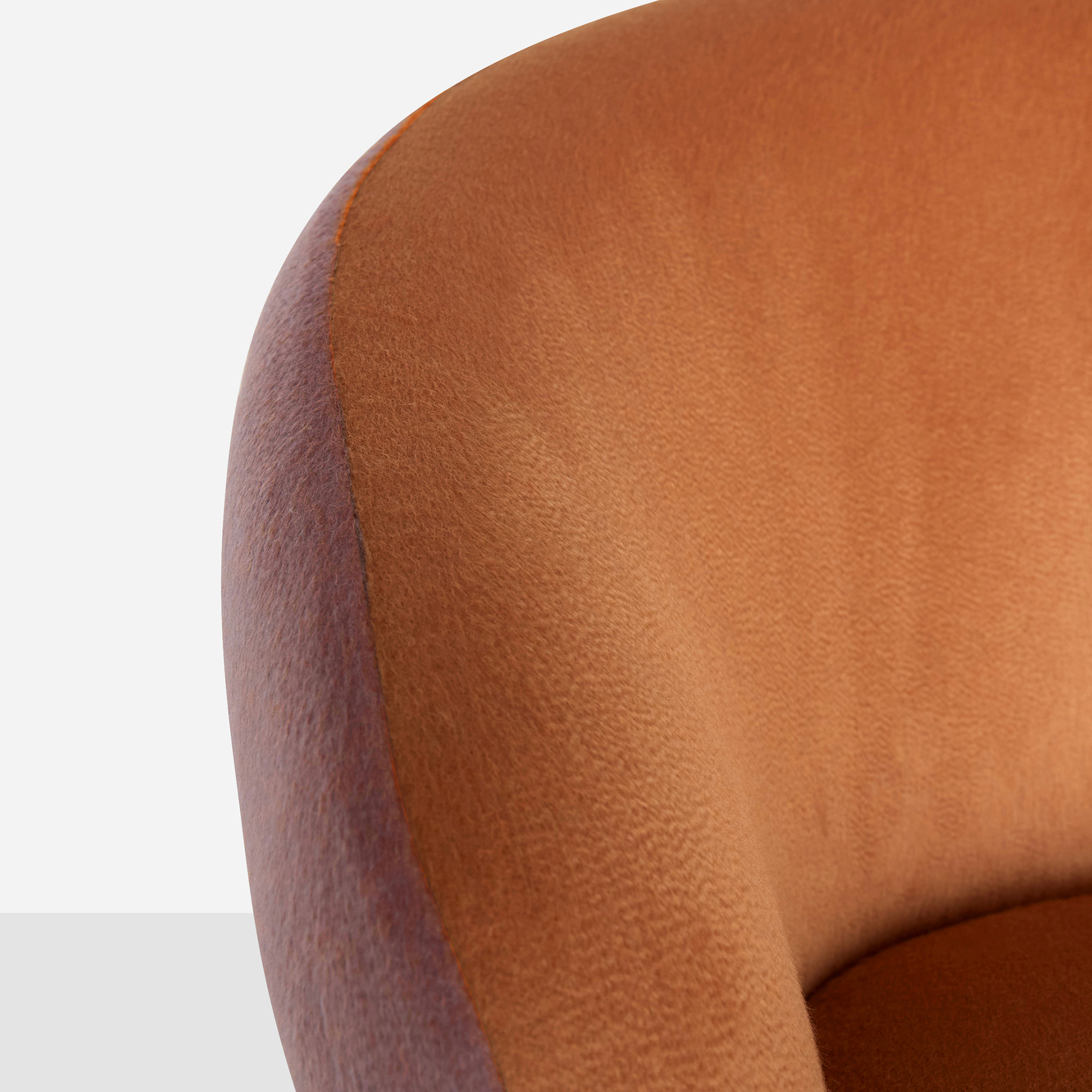 Expertly upholstered in luxurious Sandra Jordan Prima Alpaca Suri “Tamarind,” a reversible fabric thoughtfully applied with the lavender grey side wrapping the exterior and back, while the Italian clay side adorns the interior seat, creating beautiful visual depth and contrast.