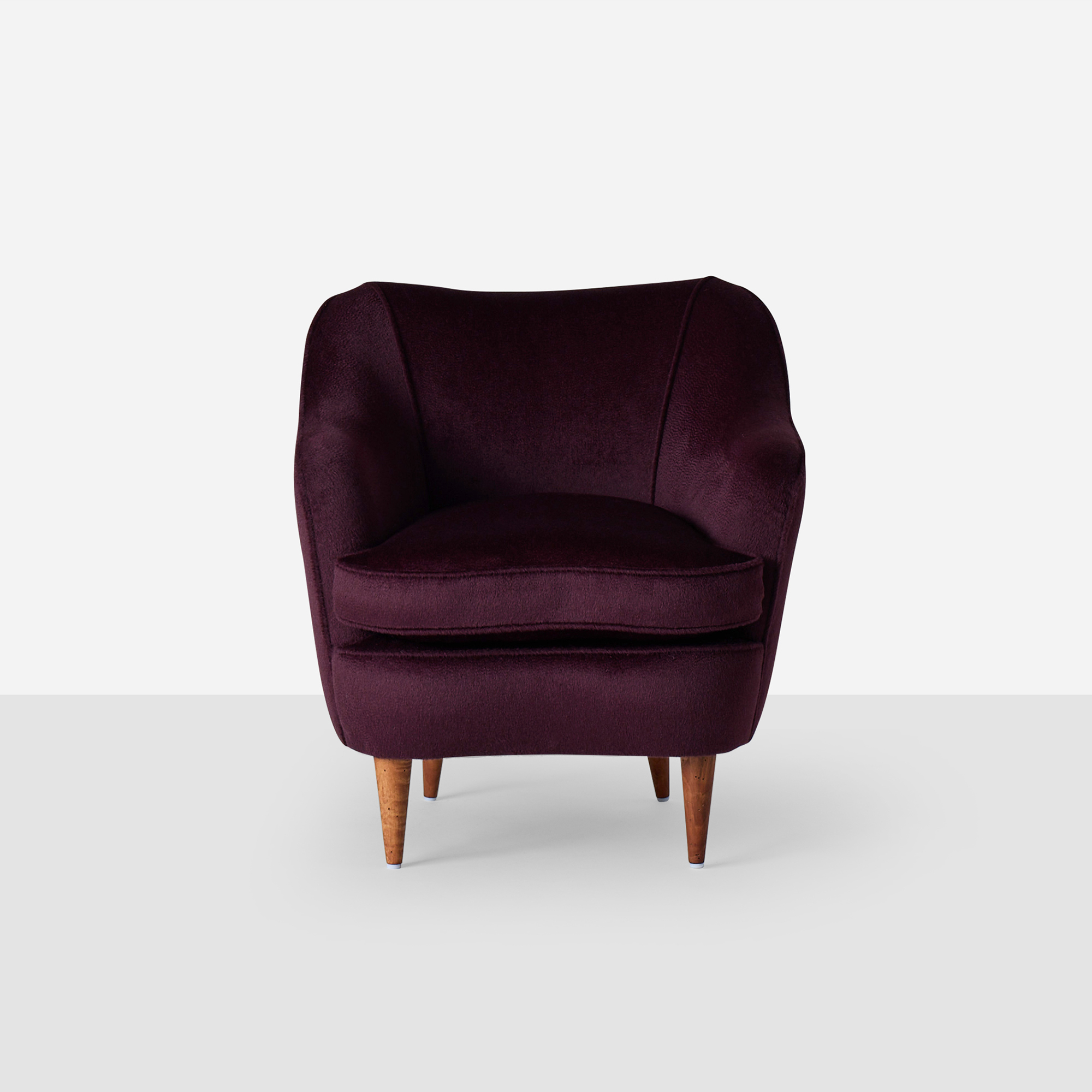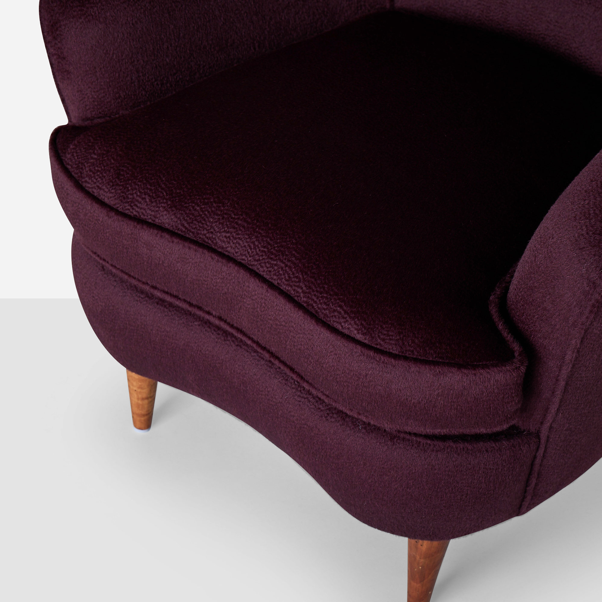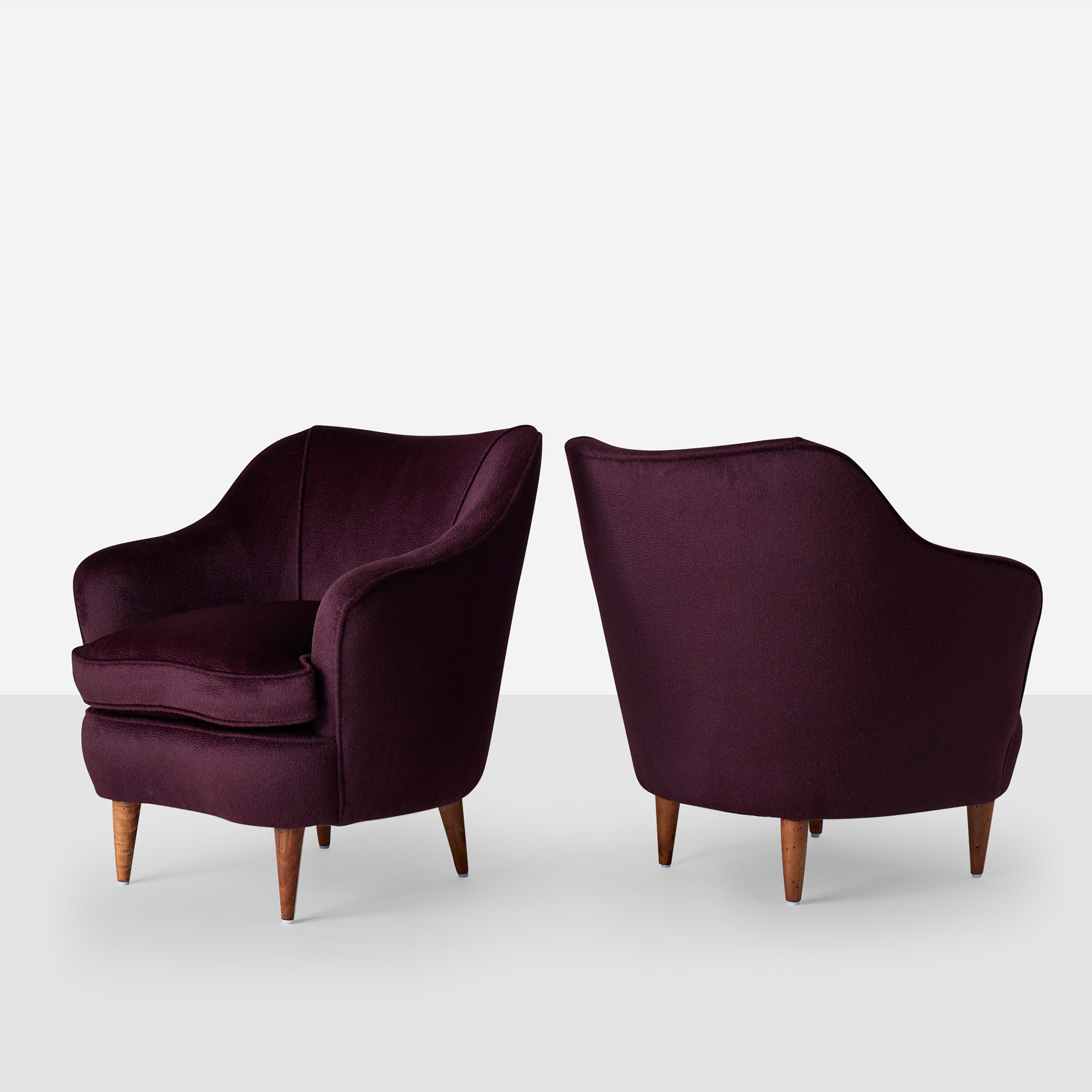 This pair of expertly restored small-scale armchairs by Gio Ponti for Casa e Giardino features tapered oak legs and rich Sandra Jordan Prima Alpaca Suri Zibelinado upholstery in Aubergine. The down-filled seat cushions provide exceptional comfort, while the luxurious fabric beautifully complements the refined proportions of these iconic mid-century pieces. Two legs have been professionally replaced during restoration.