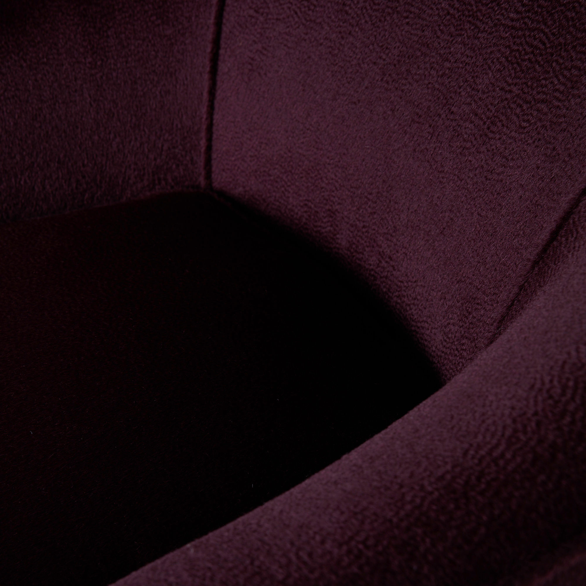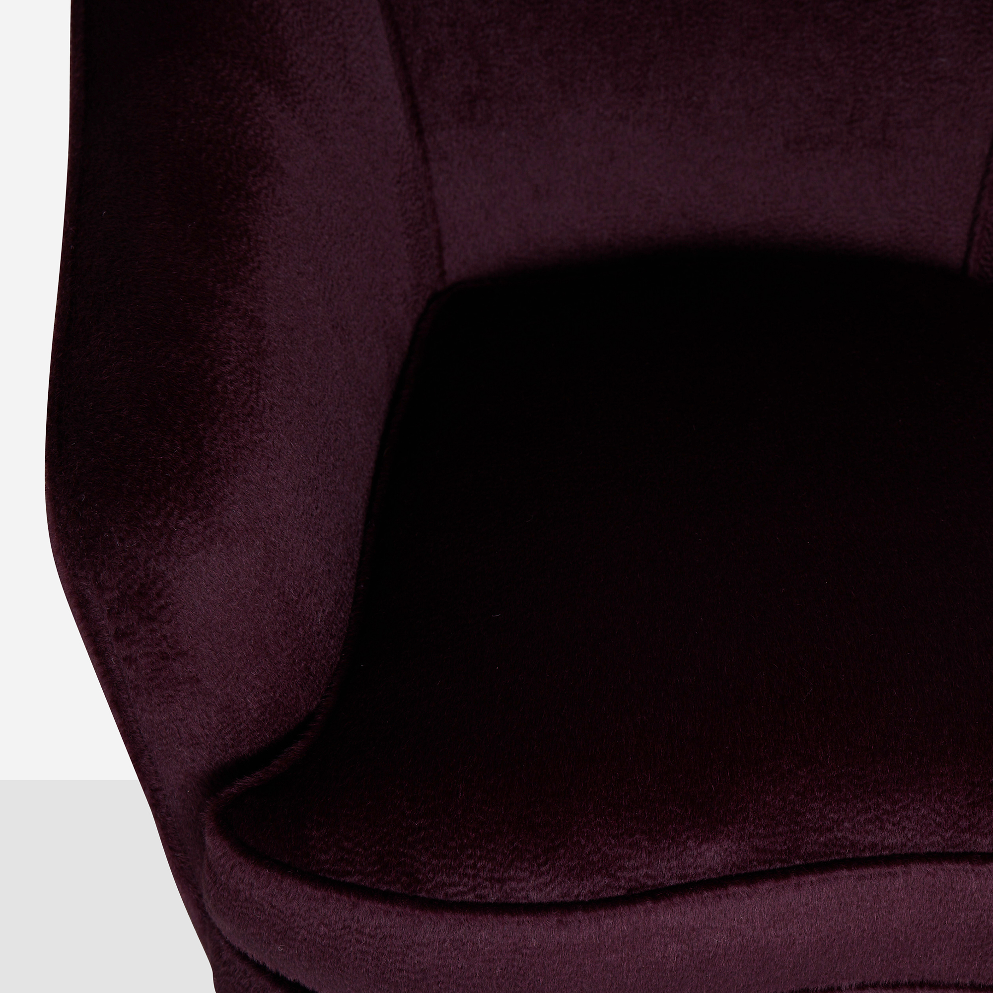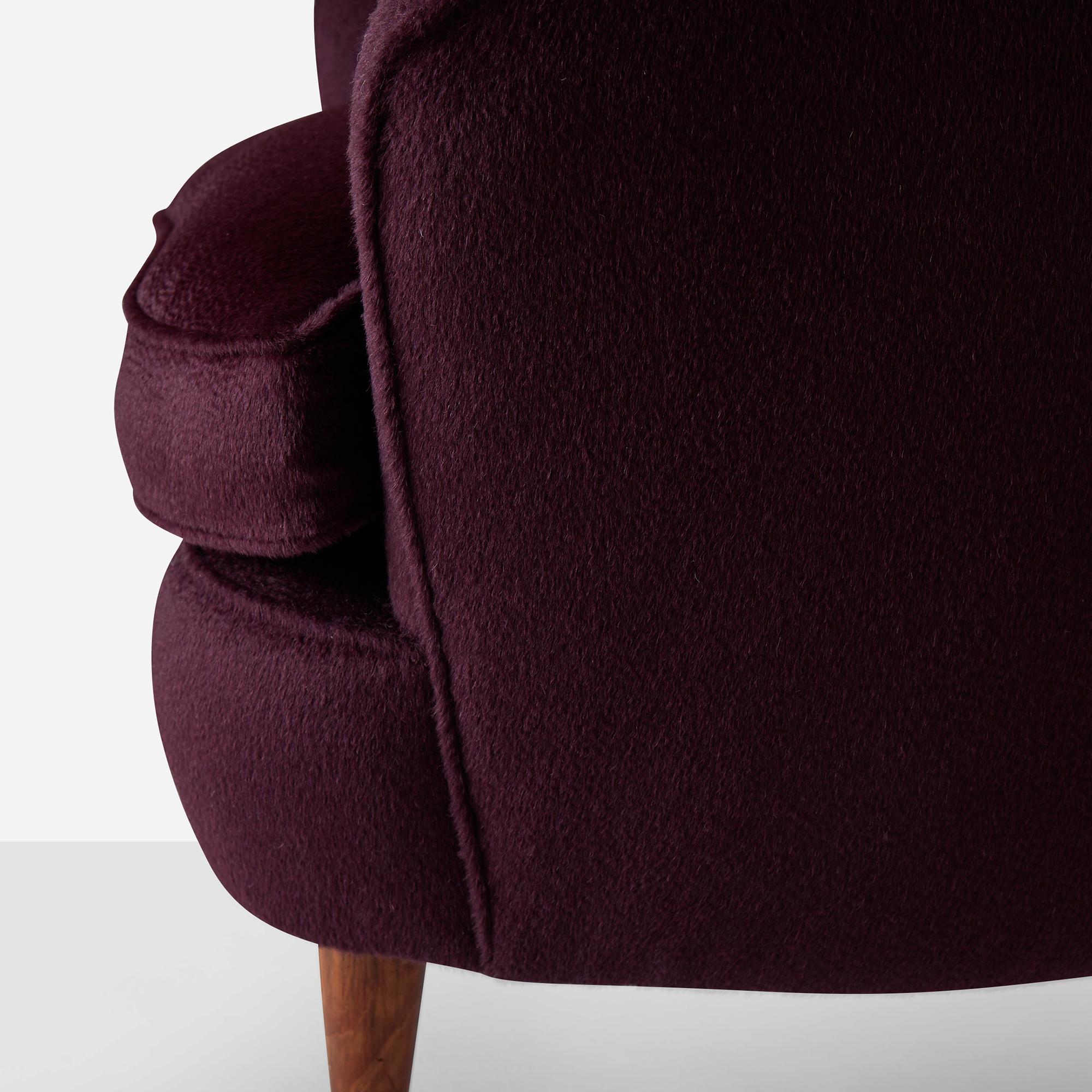 This pair of expertly restored small-scale armchairs by Gio Ponti for Casa e Giardino features tapered oak legs and rich Sandra Jordan Prima Alpaca Suri Zibelinado upholstery in Aubergine. The down-filled seat cushions provide exceptional comfort, while the luxurious fabric beautifully complements the refined proportions of these iconic mid-century pieces. Two legs have been professionally replaced during restoration.