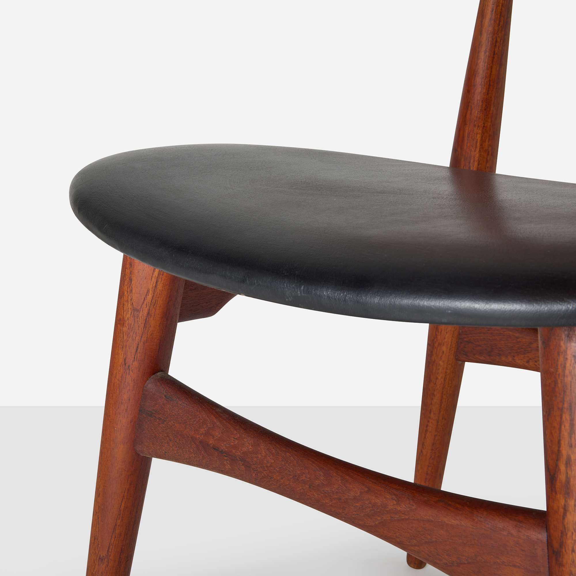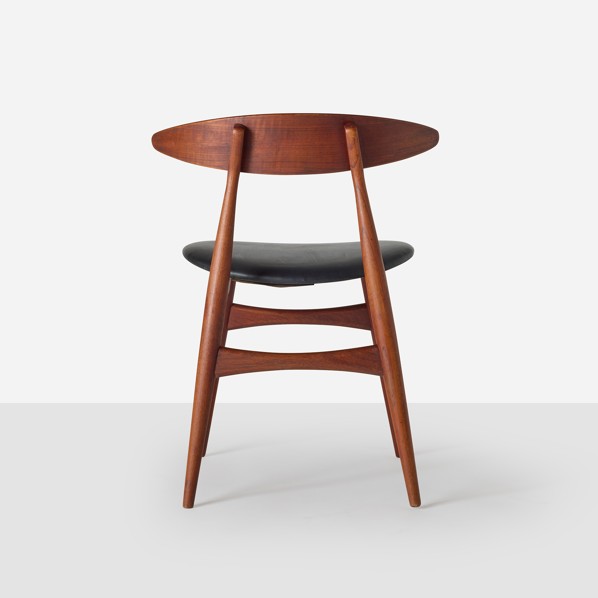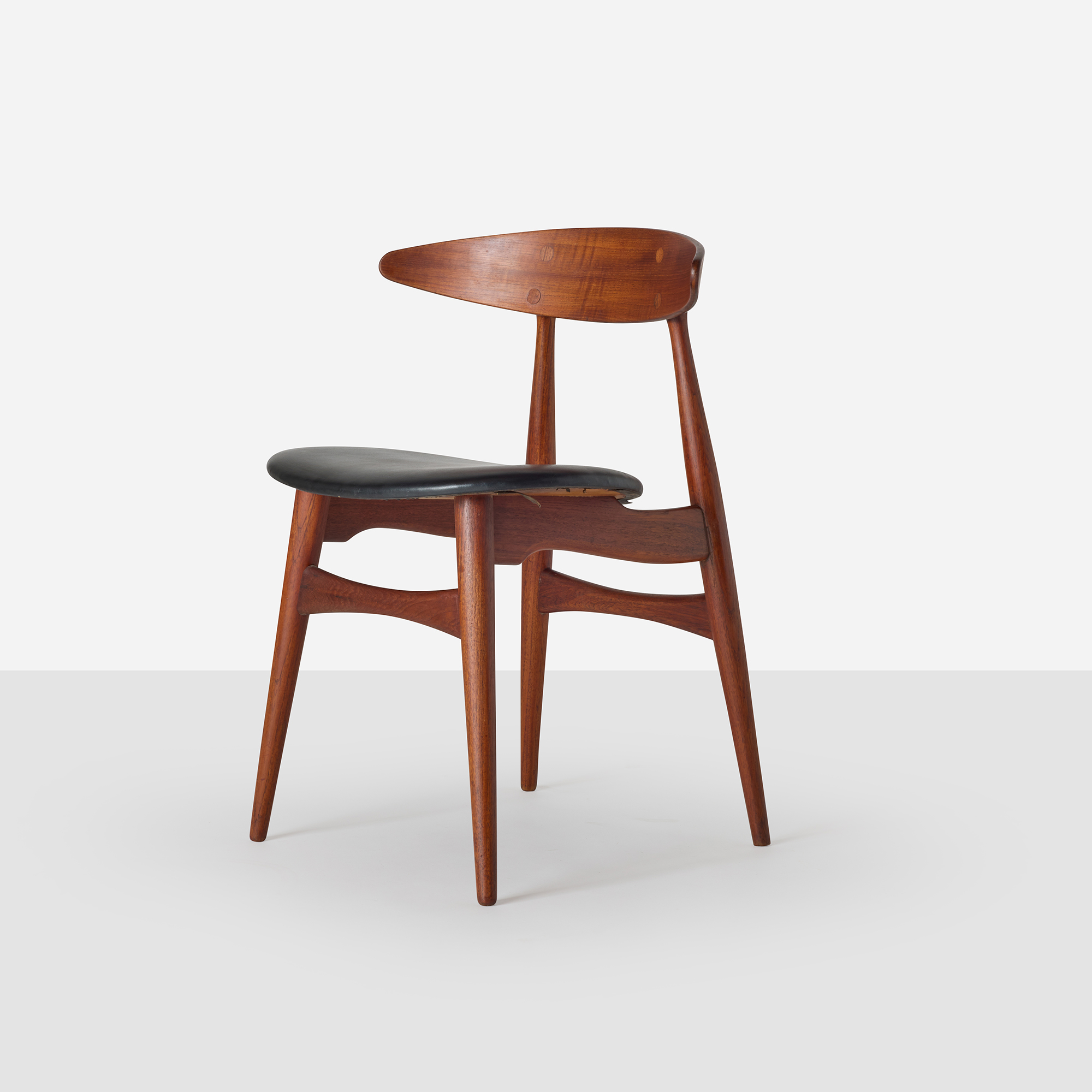 This CH33 side chair was designed by Hans J. Wegner for Carl Hansen & Søn and made in Denmark in the 1960s. It features a teak frame with a sculpted backrest and a black leather seat. The maker’s mark is present on the underside.