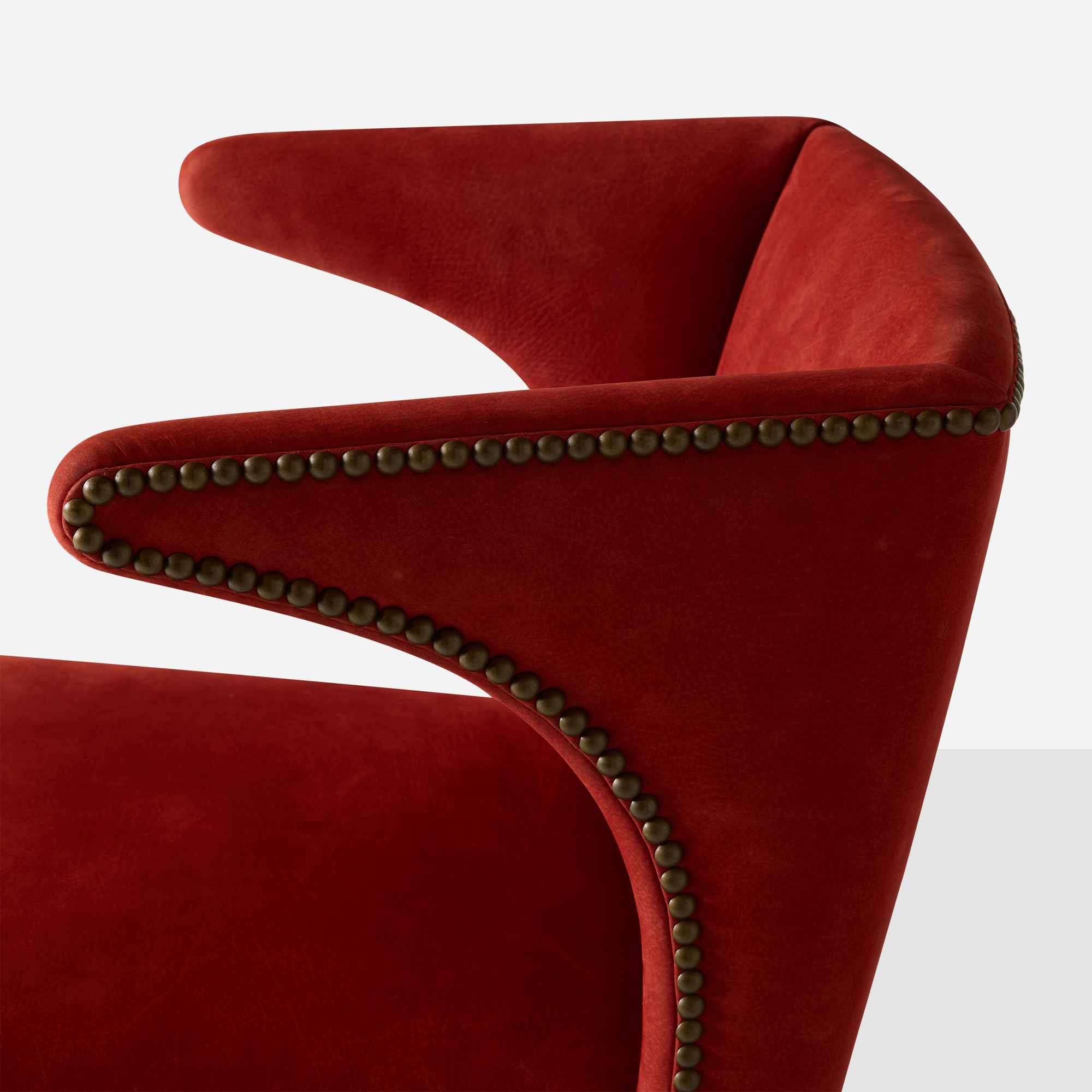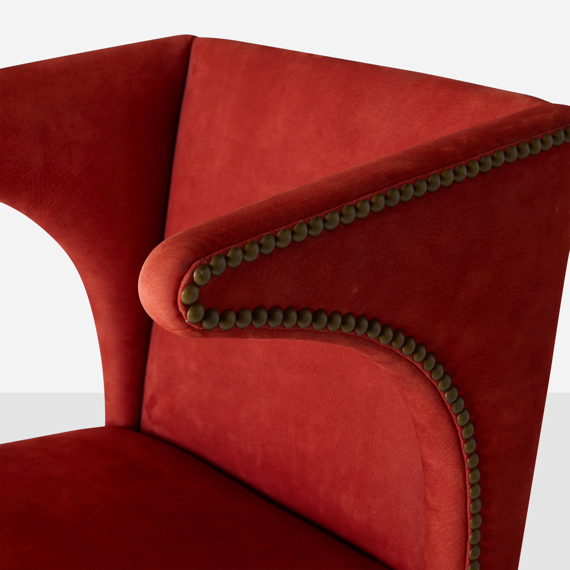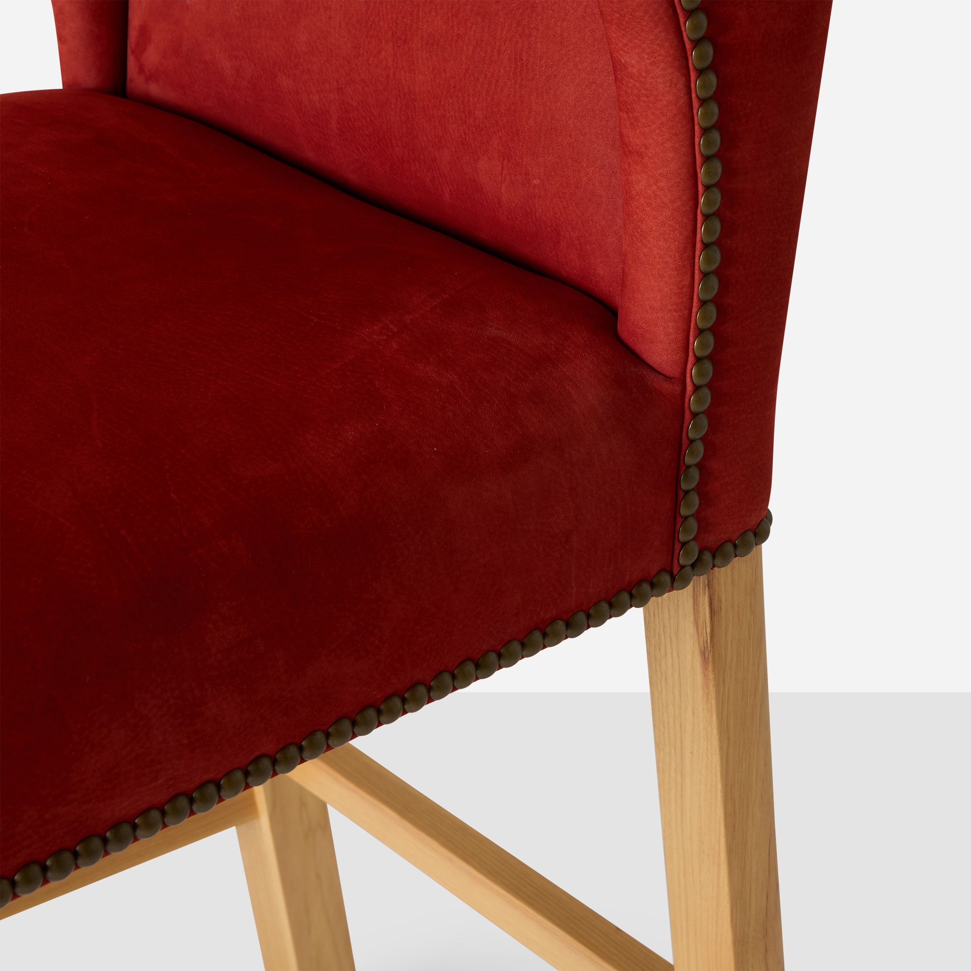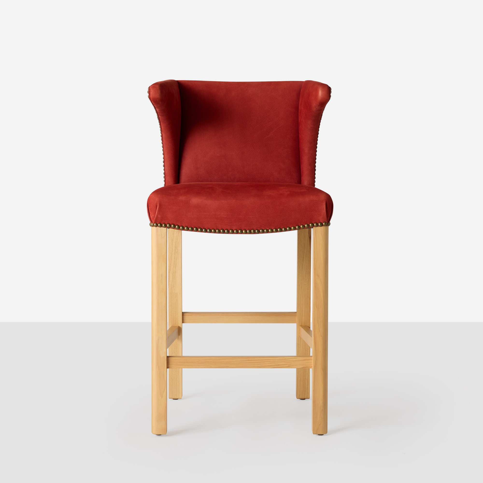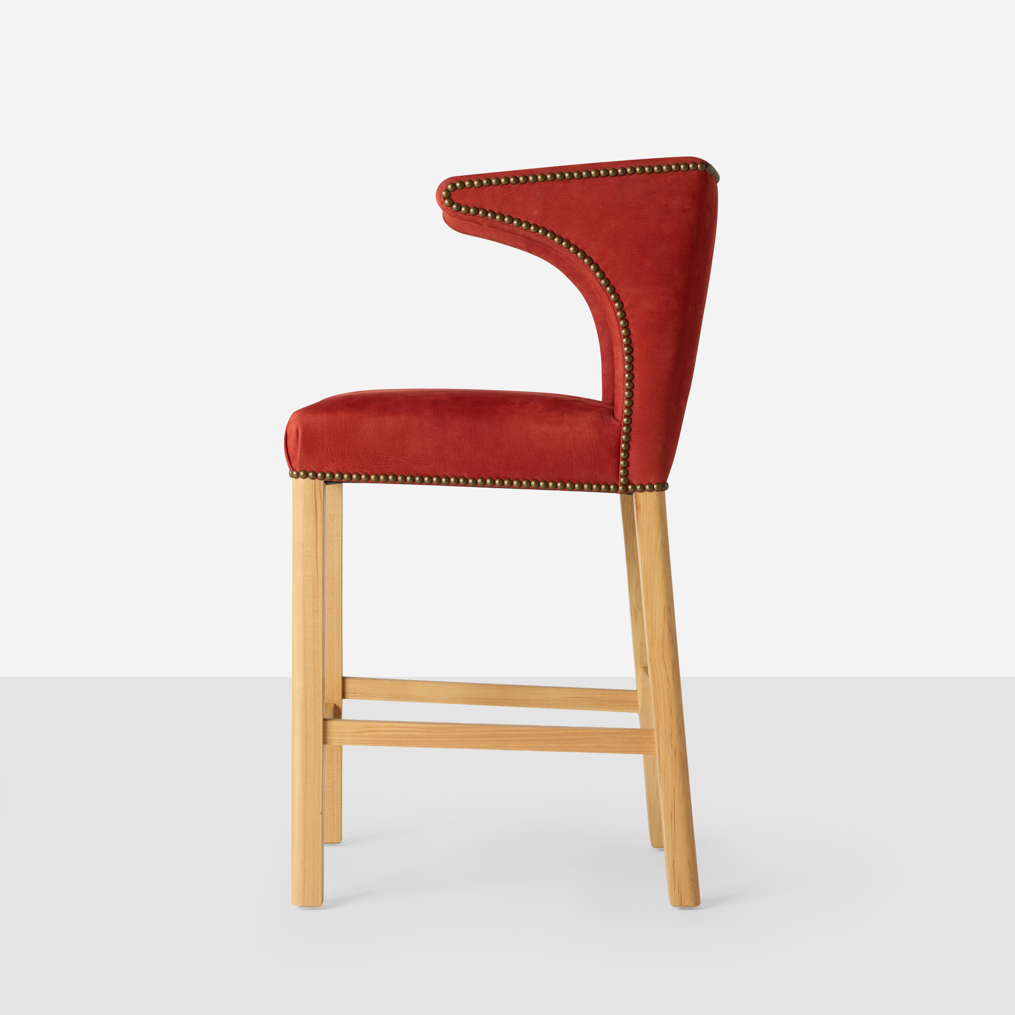 A counter stool in the style of Frits Henningsen. Red nubuck leather upholstery with patinated brass nailhead trim on a maple frame. Contemporary production from, 2011.