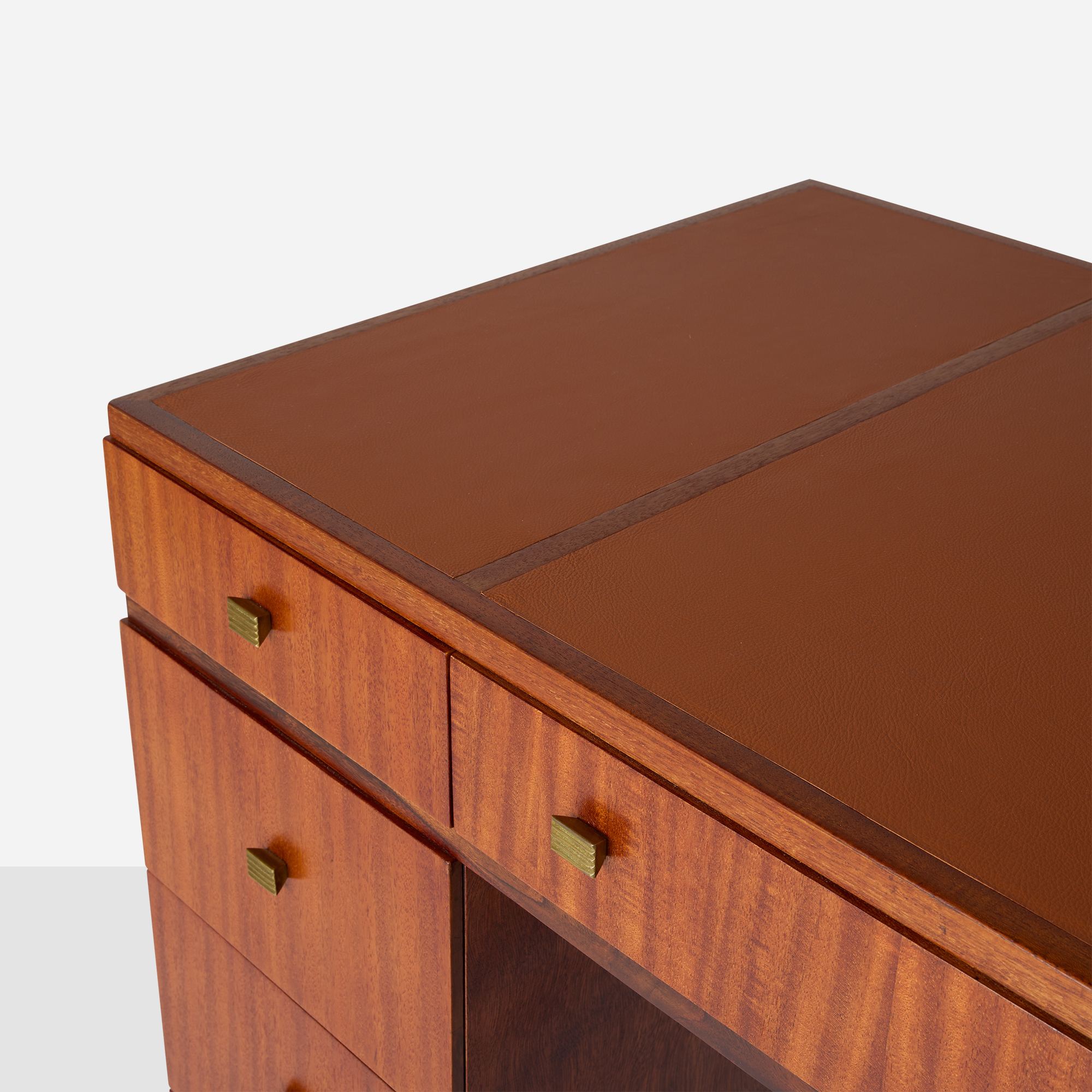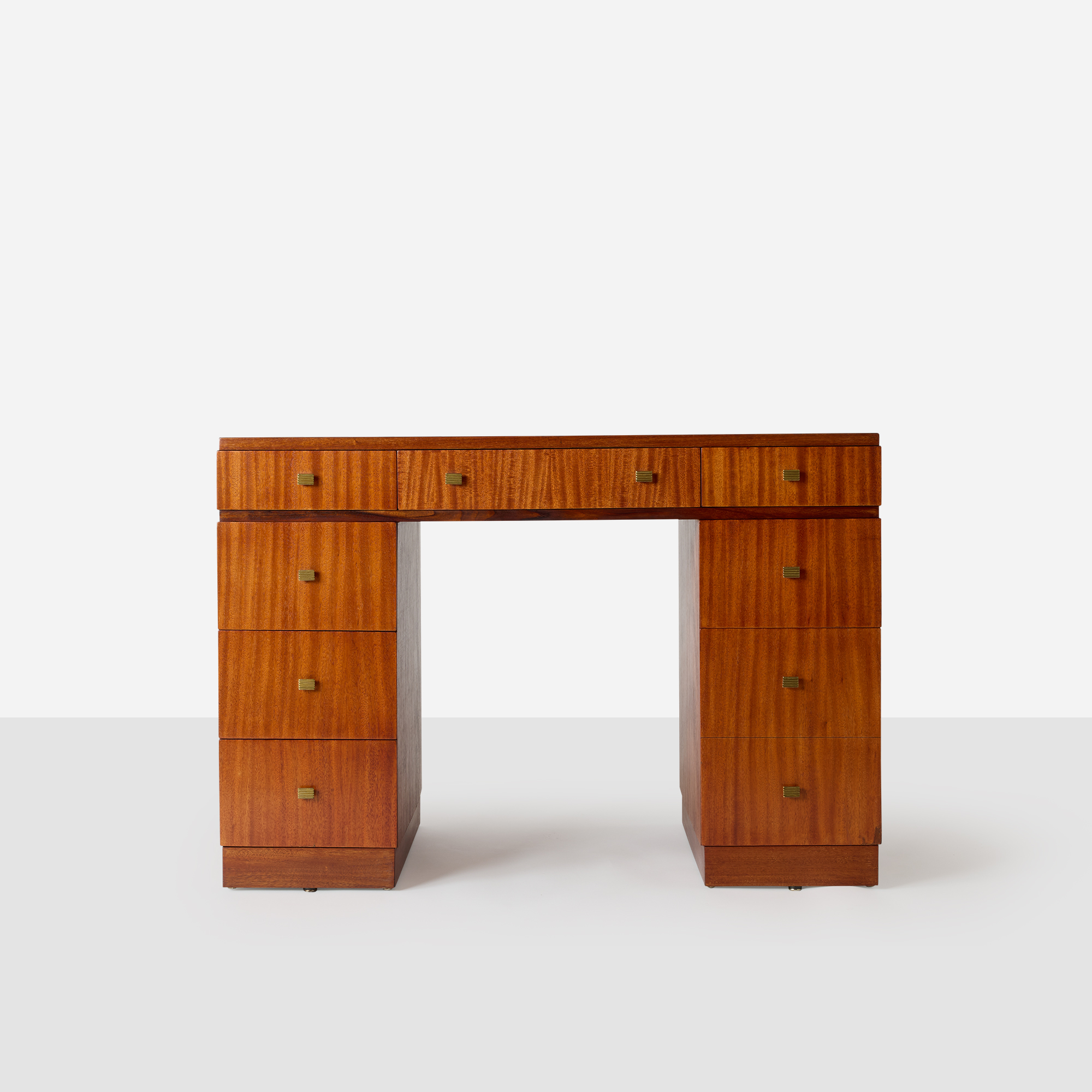 A walnut desk with new inset leather top 8 drawers with brass pulls. Stamped Dunbar on underside of top center drawer.