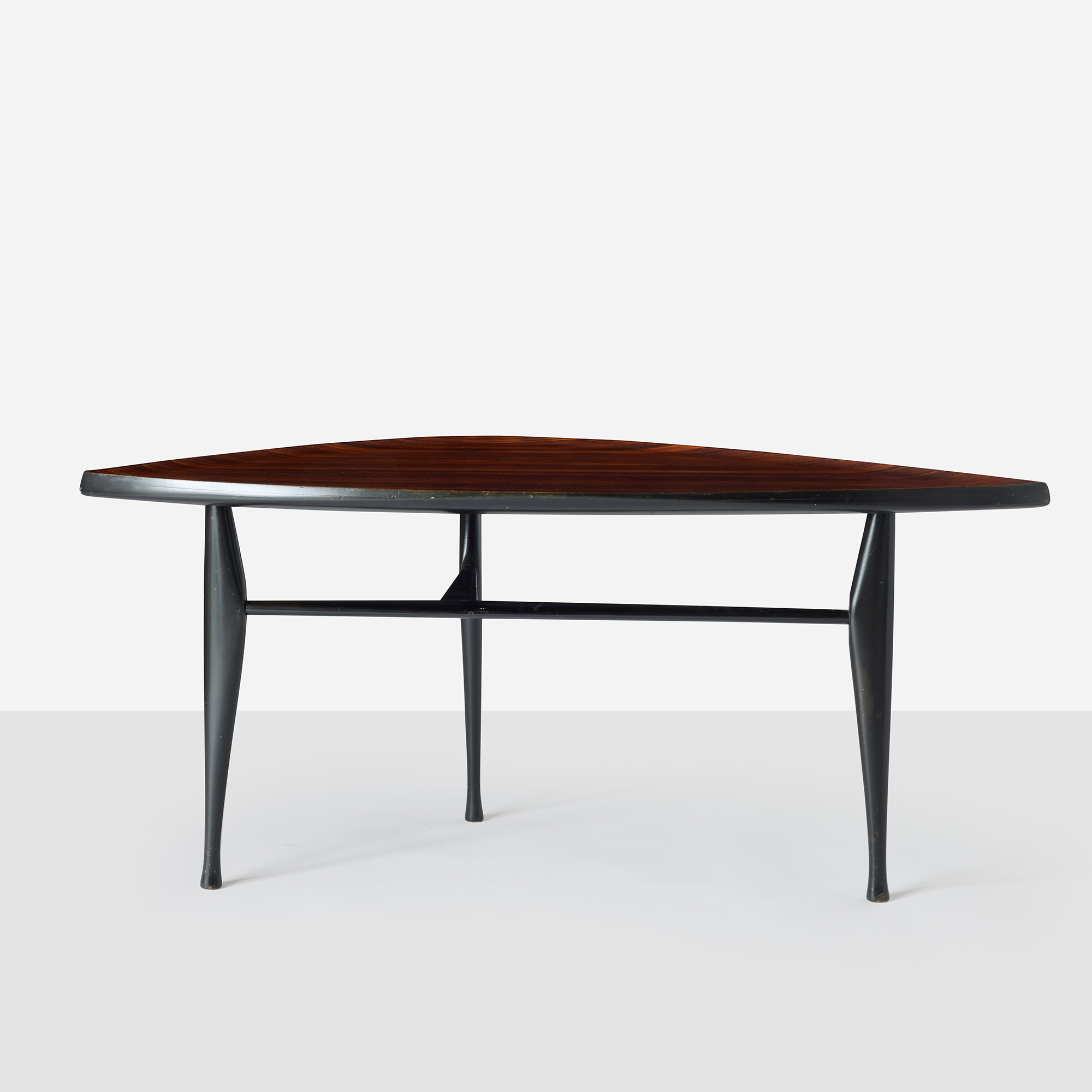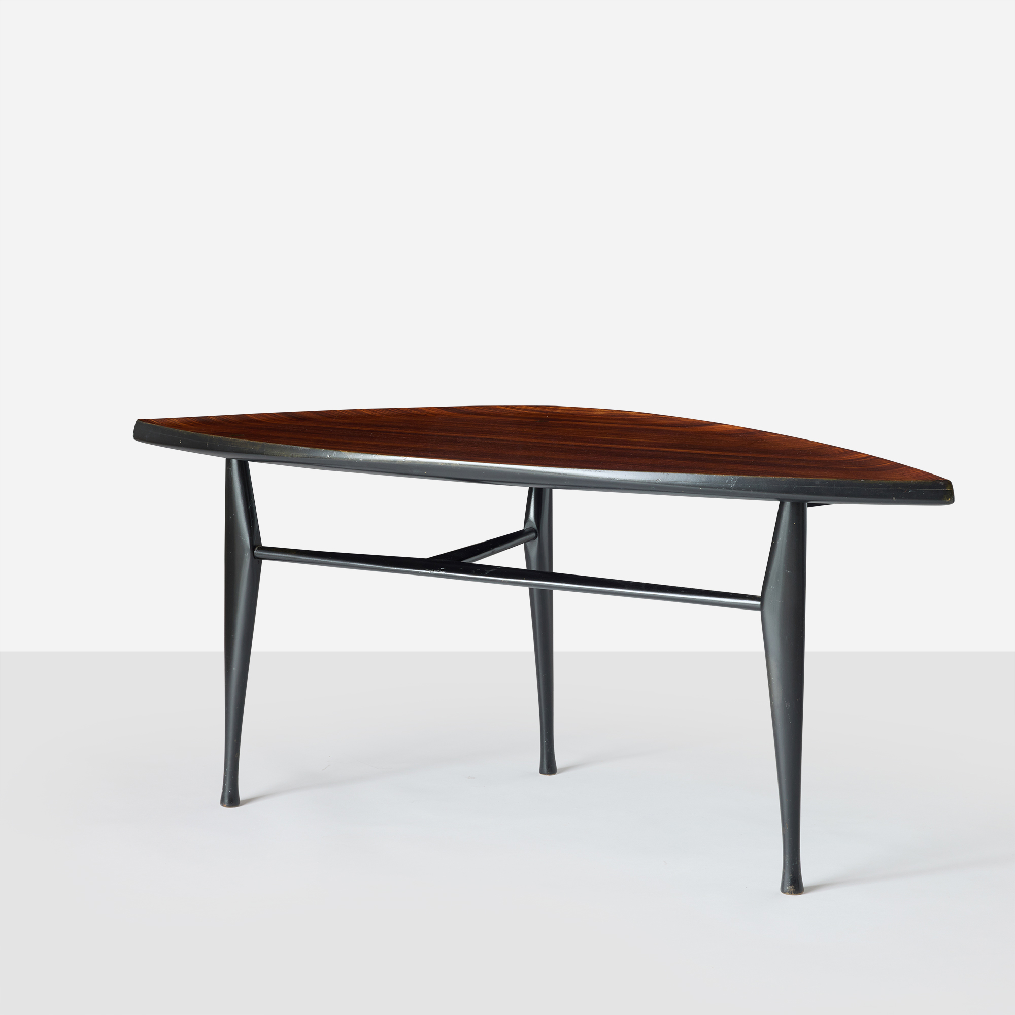 Rare leaf shaped “Rytm” end table by Yngve Ekström featuring a rosewood table top and black lacquered legs. Retains the Illums Bolighus label on underside. Expertly restored, this table is in great condition.