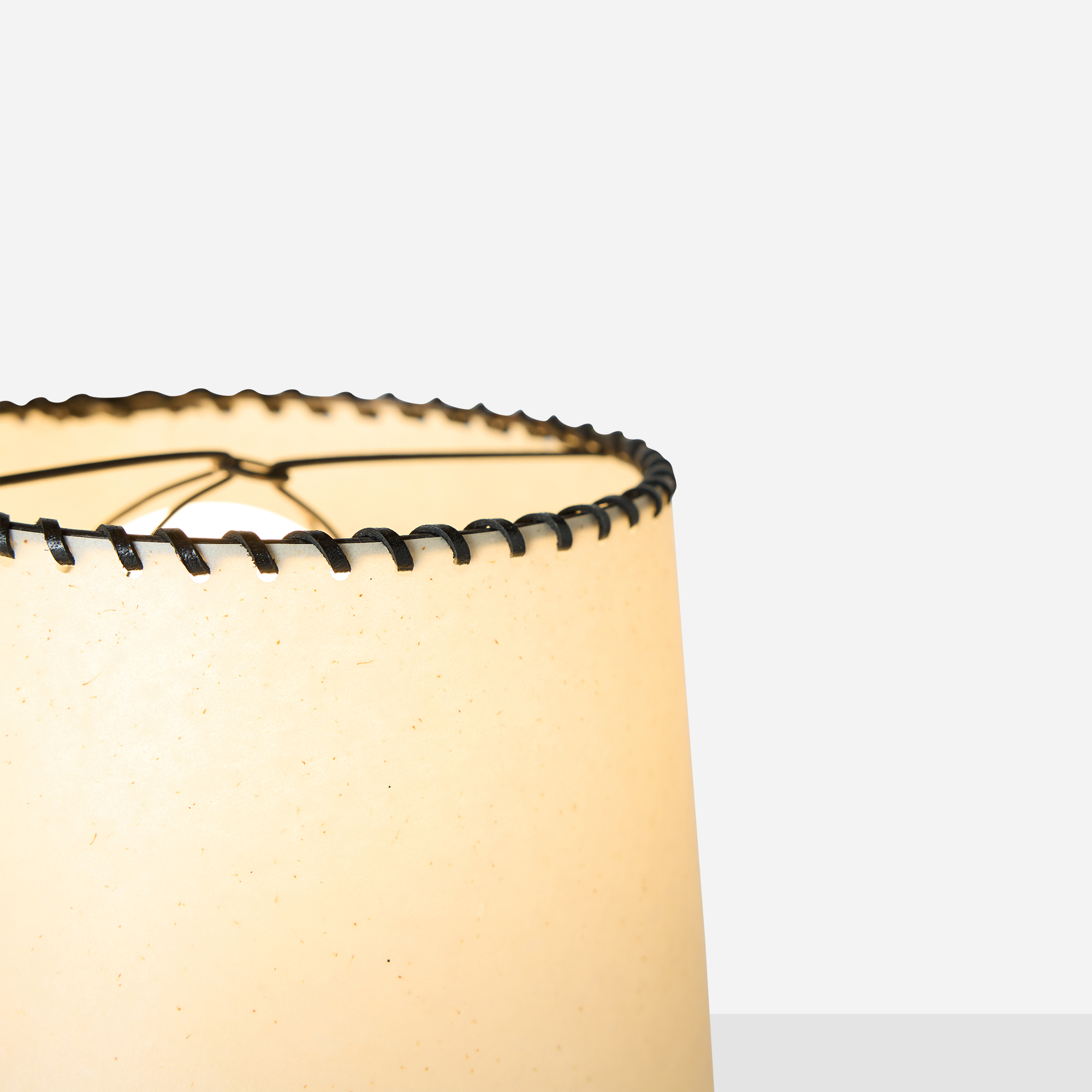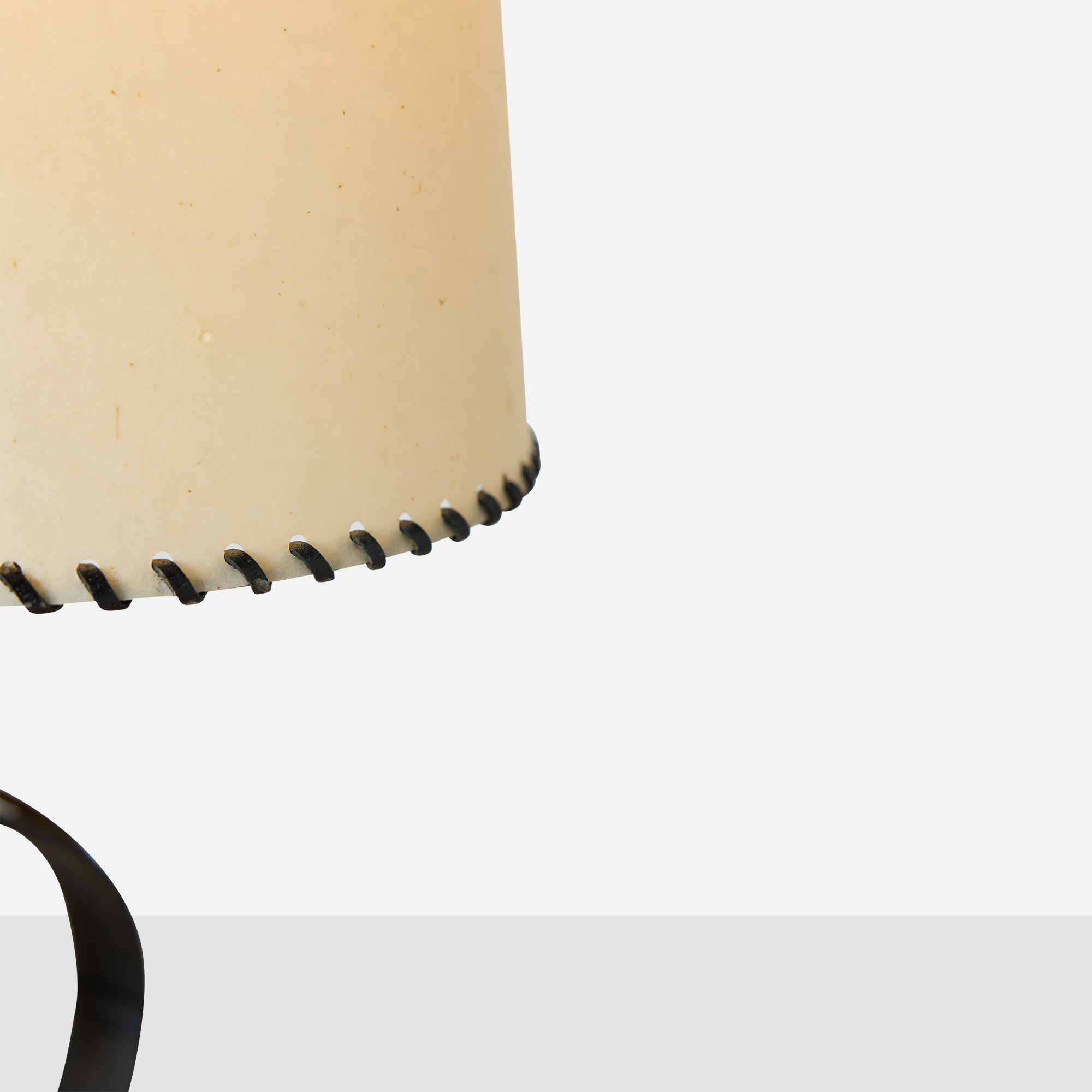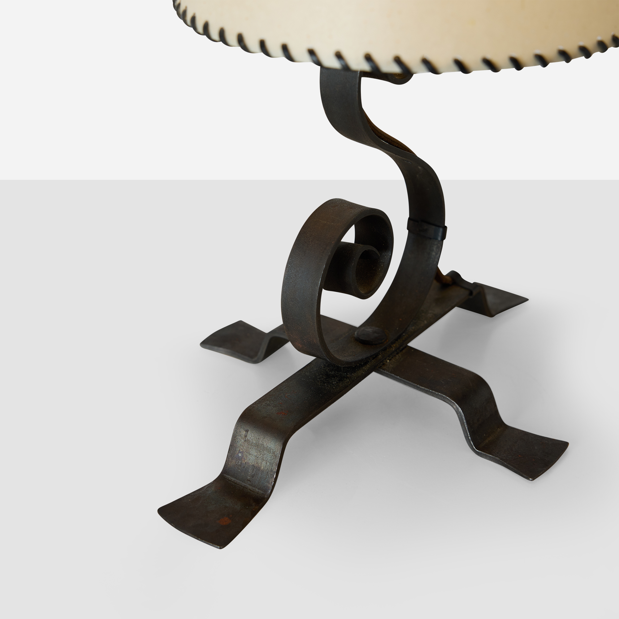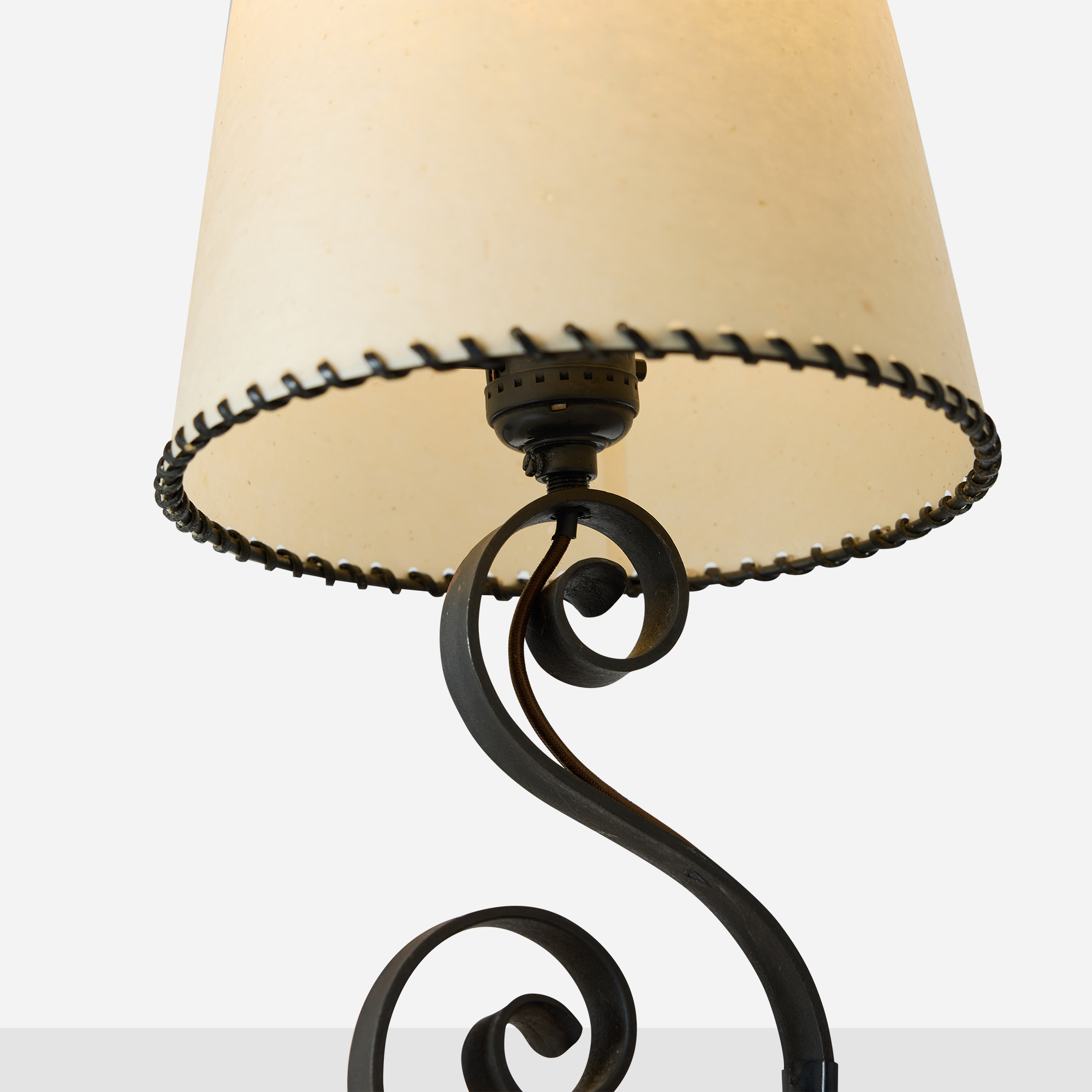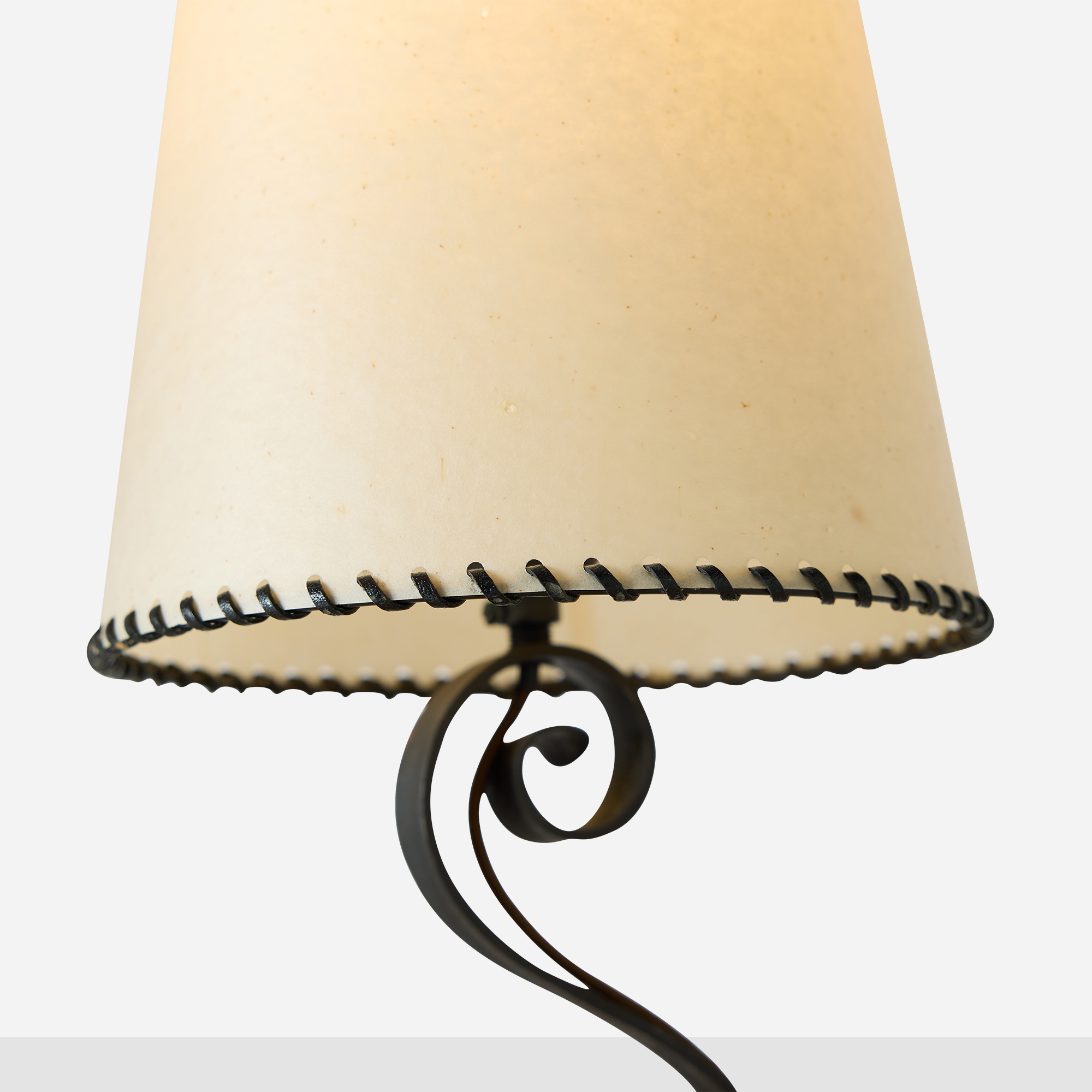 Parchment and leather-edged shades with ono fittings. Light oxidation to iron consistent with age. Minor denting to one shade, inconspicuous in situ.