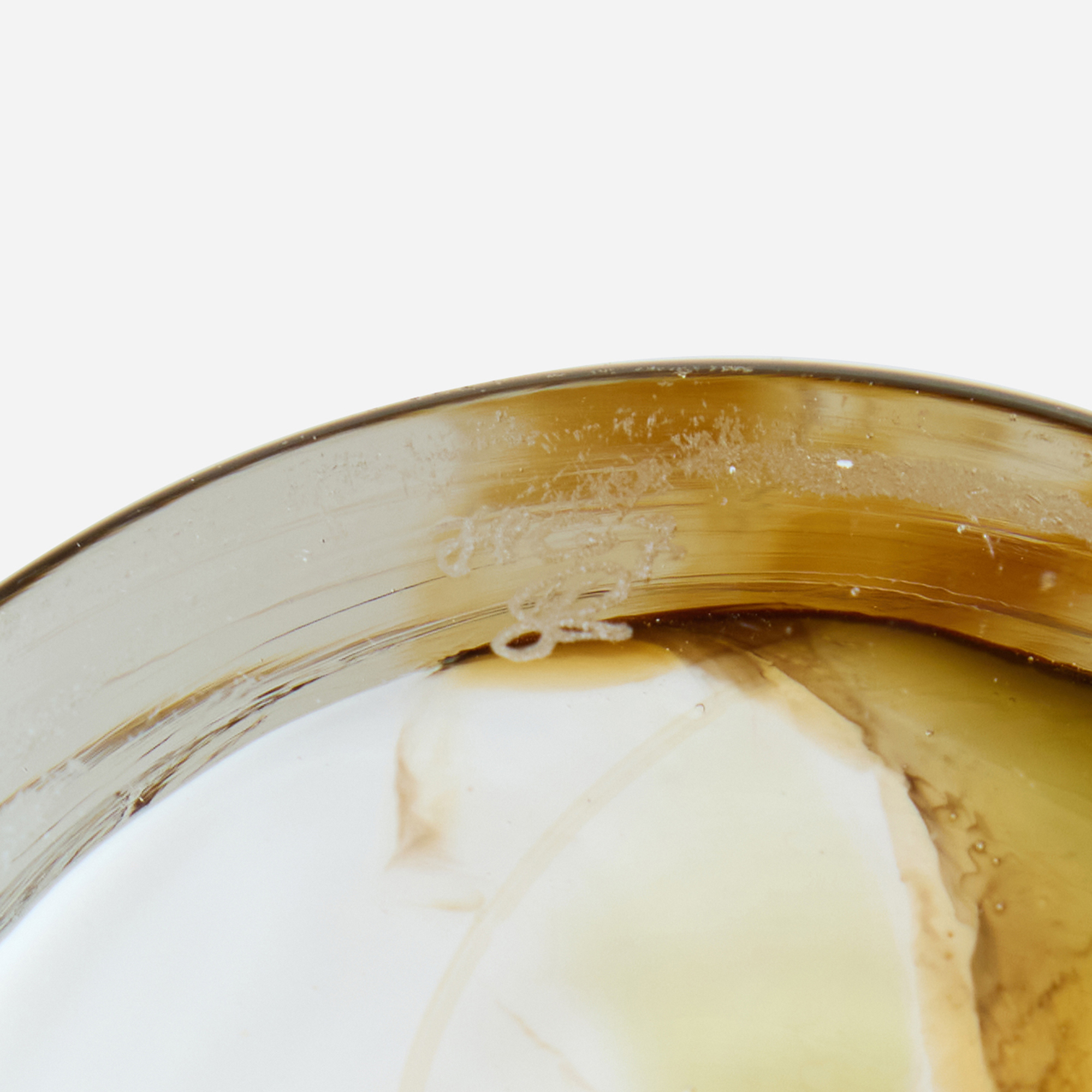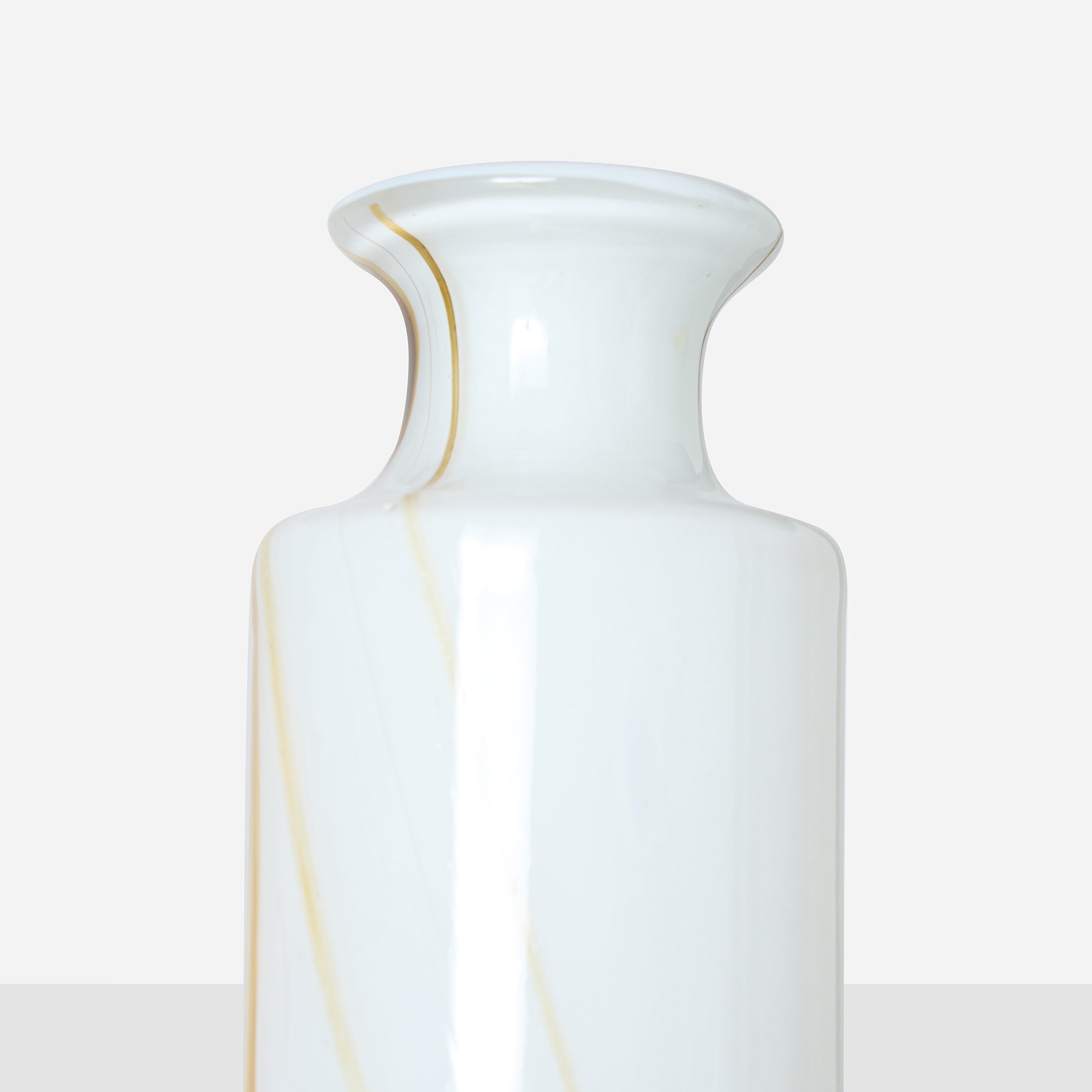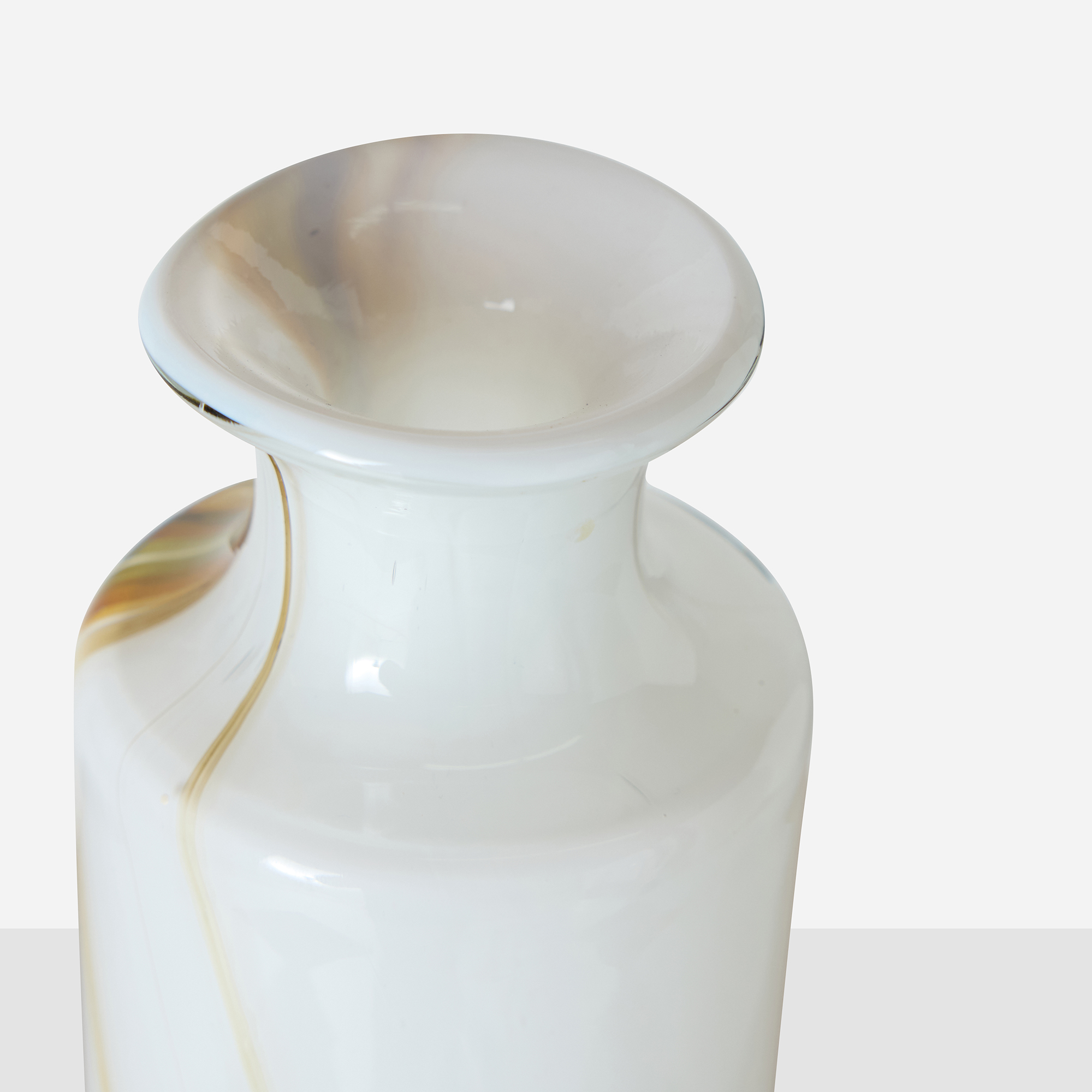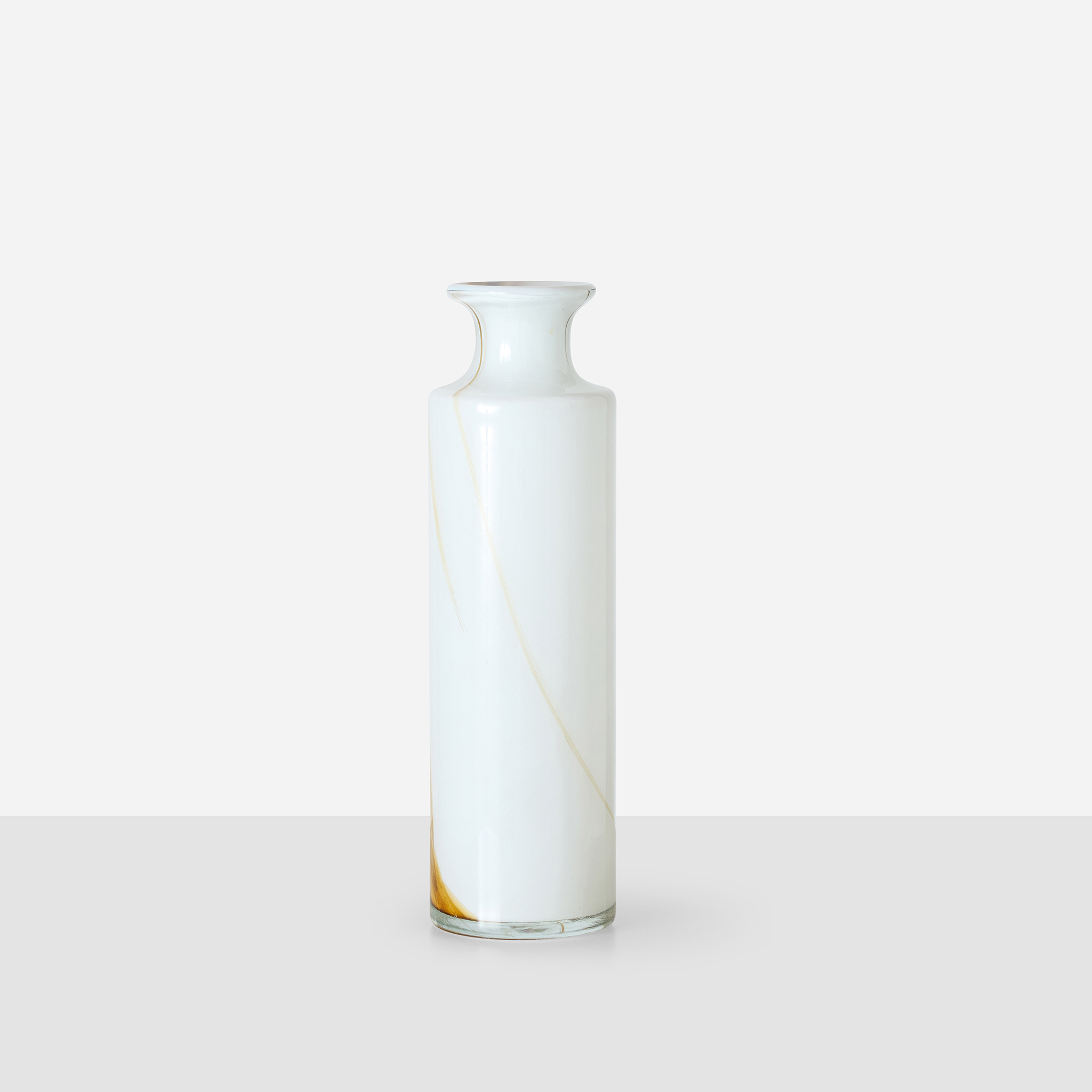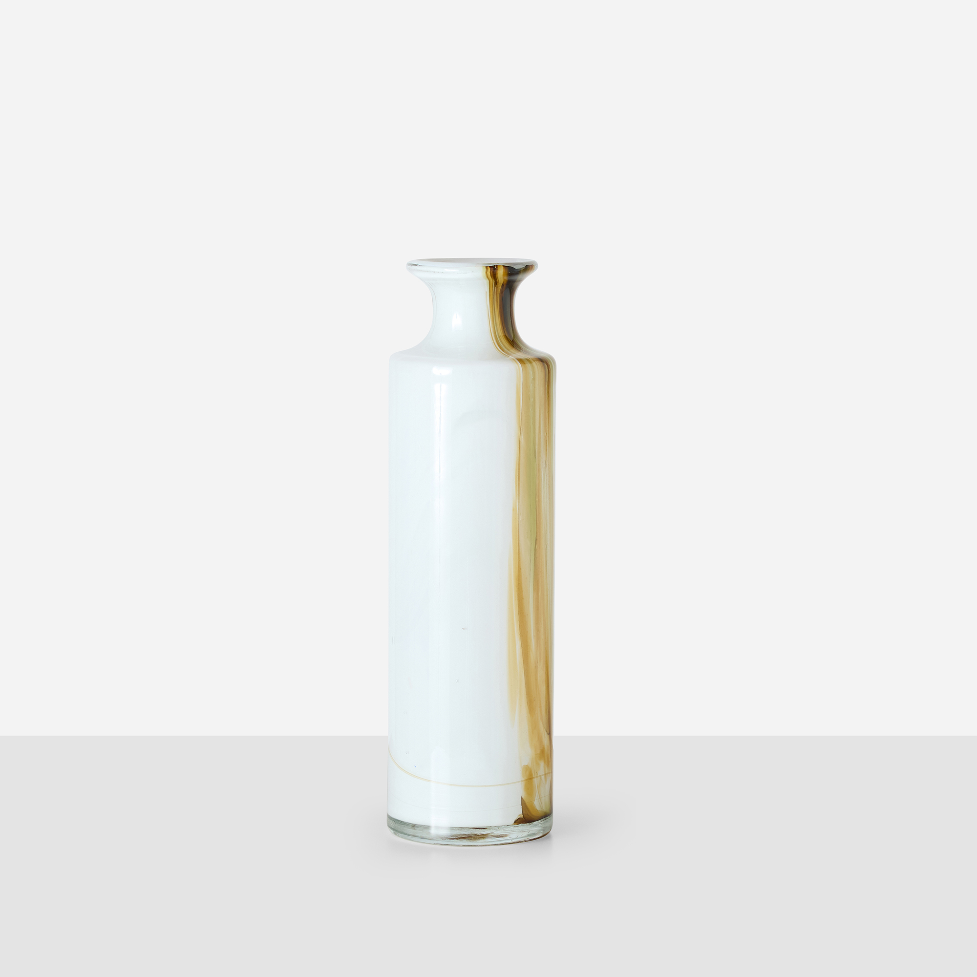Cased opaline white glass with vertical amber and olive streaks from Per Lütken’s Cascade series for Holmegaard. Tall cylindrical form with flared rim, signature etched to base. Very good vintage condition, showing no chips or scratches.