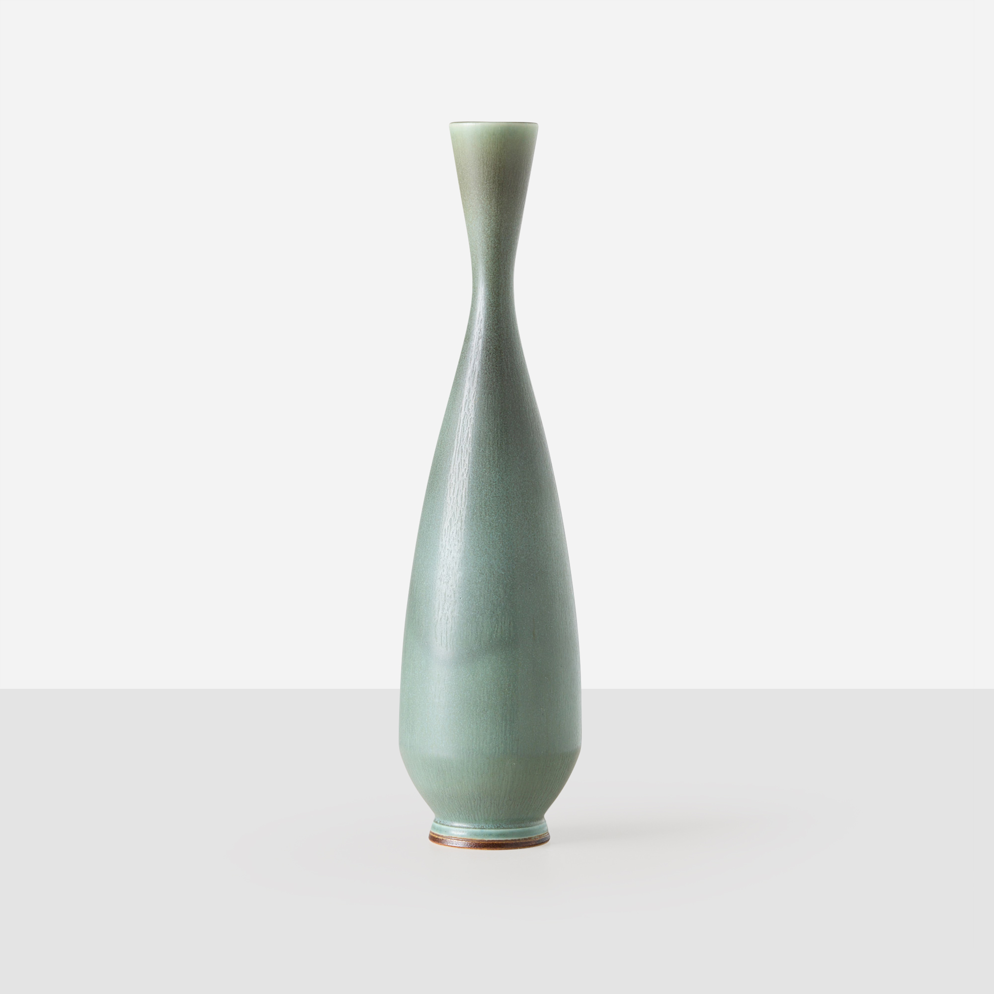 This wheel-thrown stoneware vase by Berndt Friberg features a long, thin neck and a smooth glaze in hues of pale greens and greys. It exemplifies Friberg’s refined craftsmanship and elegant form. The underside is etched with “Friberg” and marked with the Gustavsberg hand studio mark. The base is also stamped with the letter “F,” indicating it was produced in 1965.