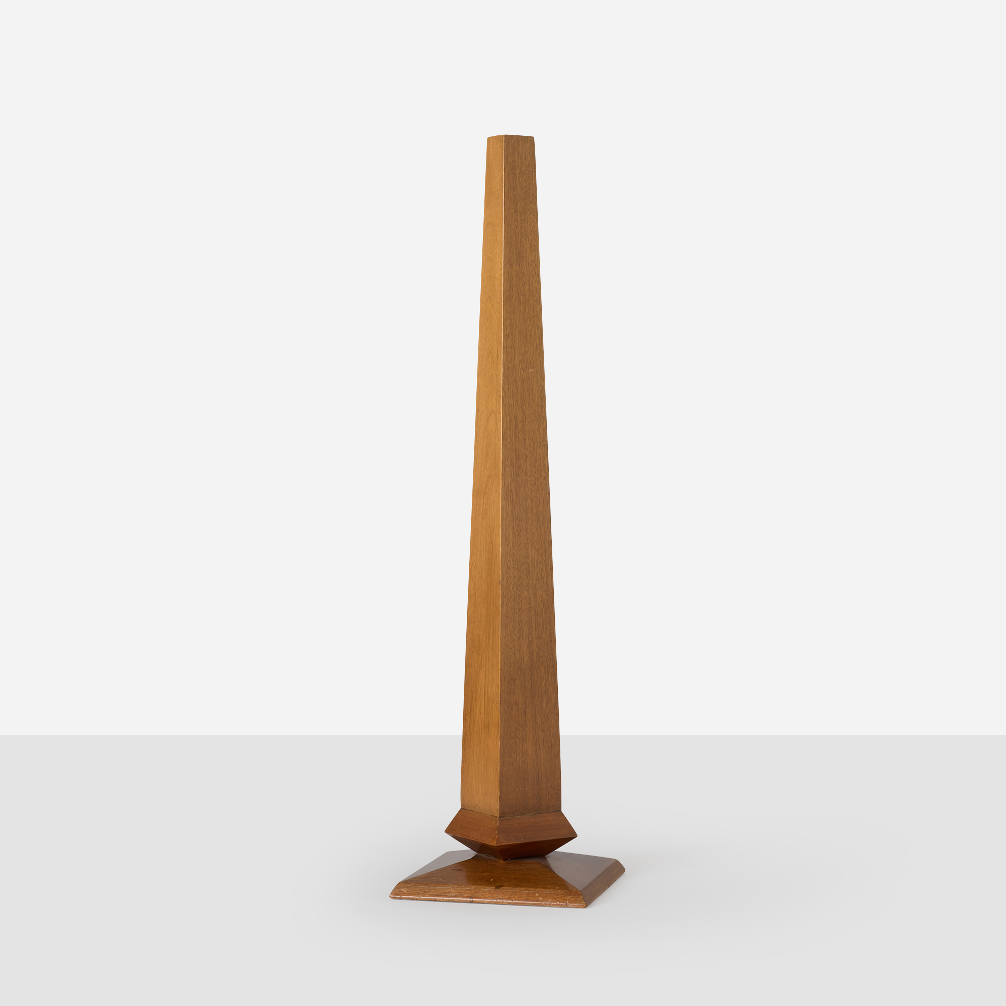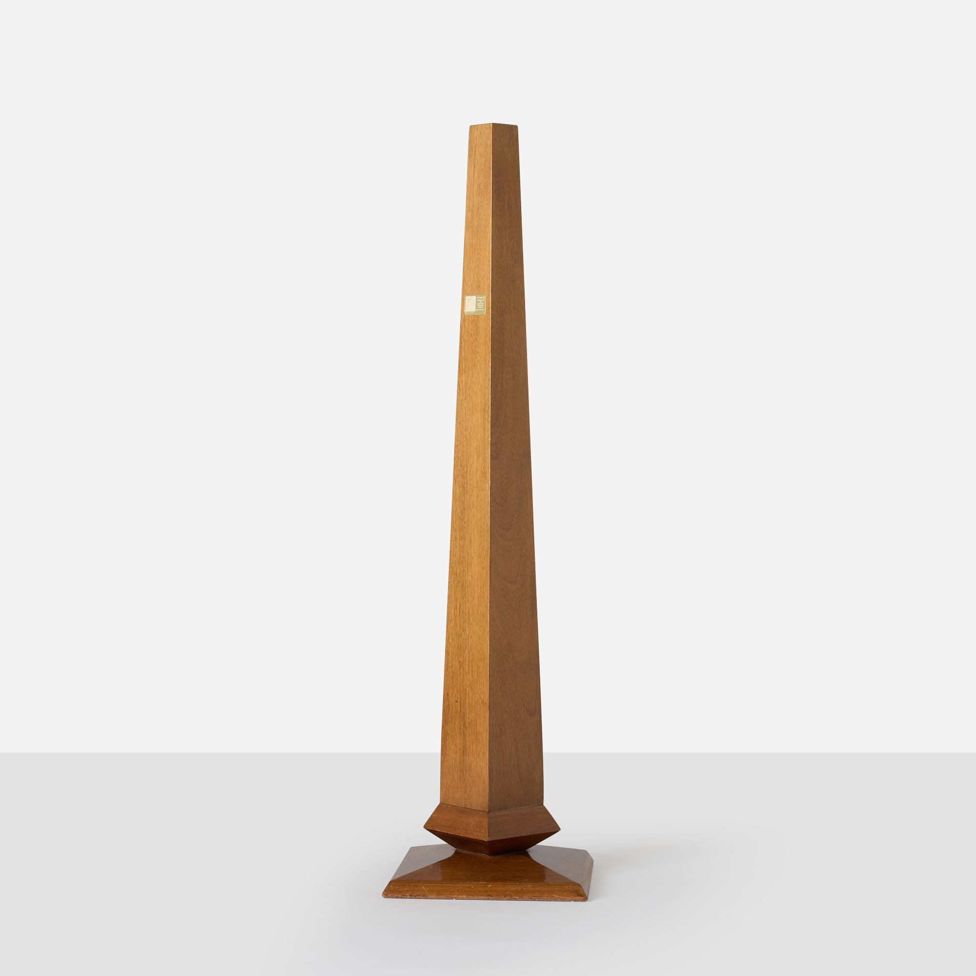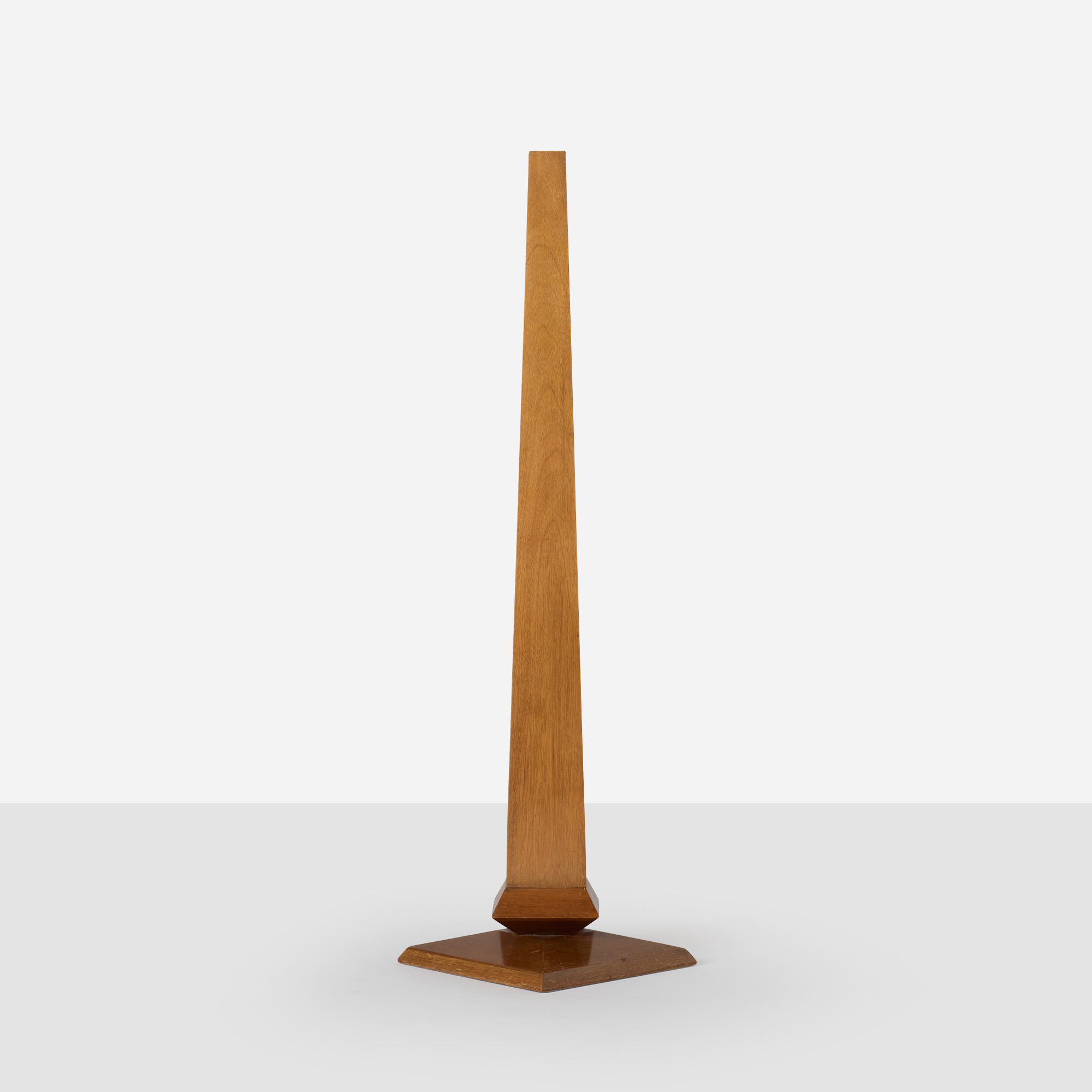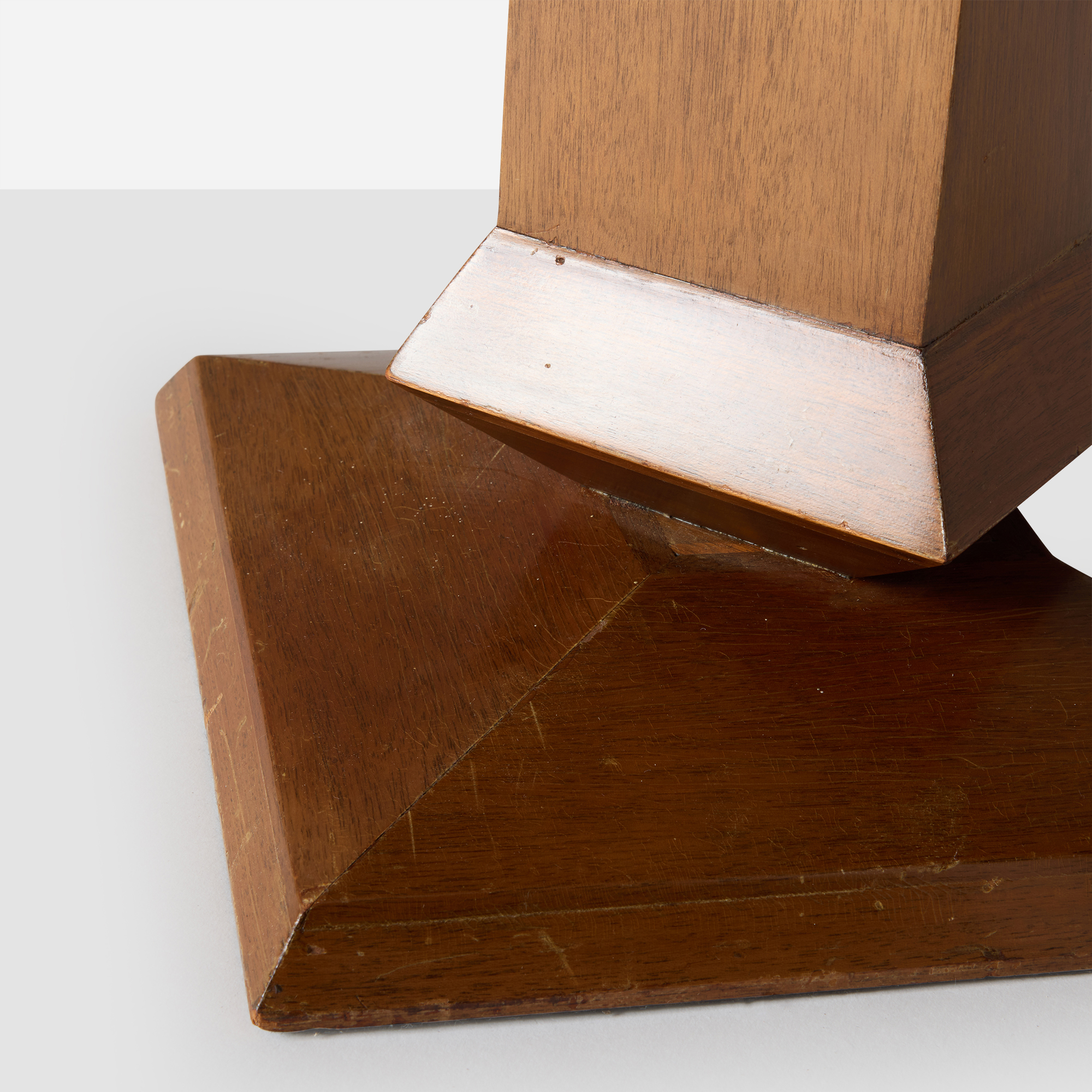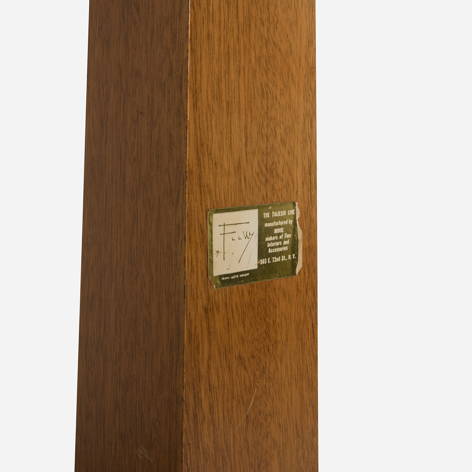 Made from mahogany with a copper insert and matching copper label, this tall weed holder was designed by Frank Lloyd Wright and produced by Valentine Minnich of Minic Accessories in 1953. The form is based on a slender design Wright created around 1895. It retains the original manufacturer’s label and comes from a notable private collection. A similar example is held in the collection of the Metropolitan Museum of Art.