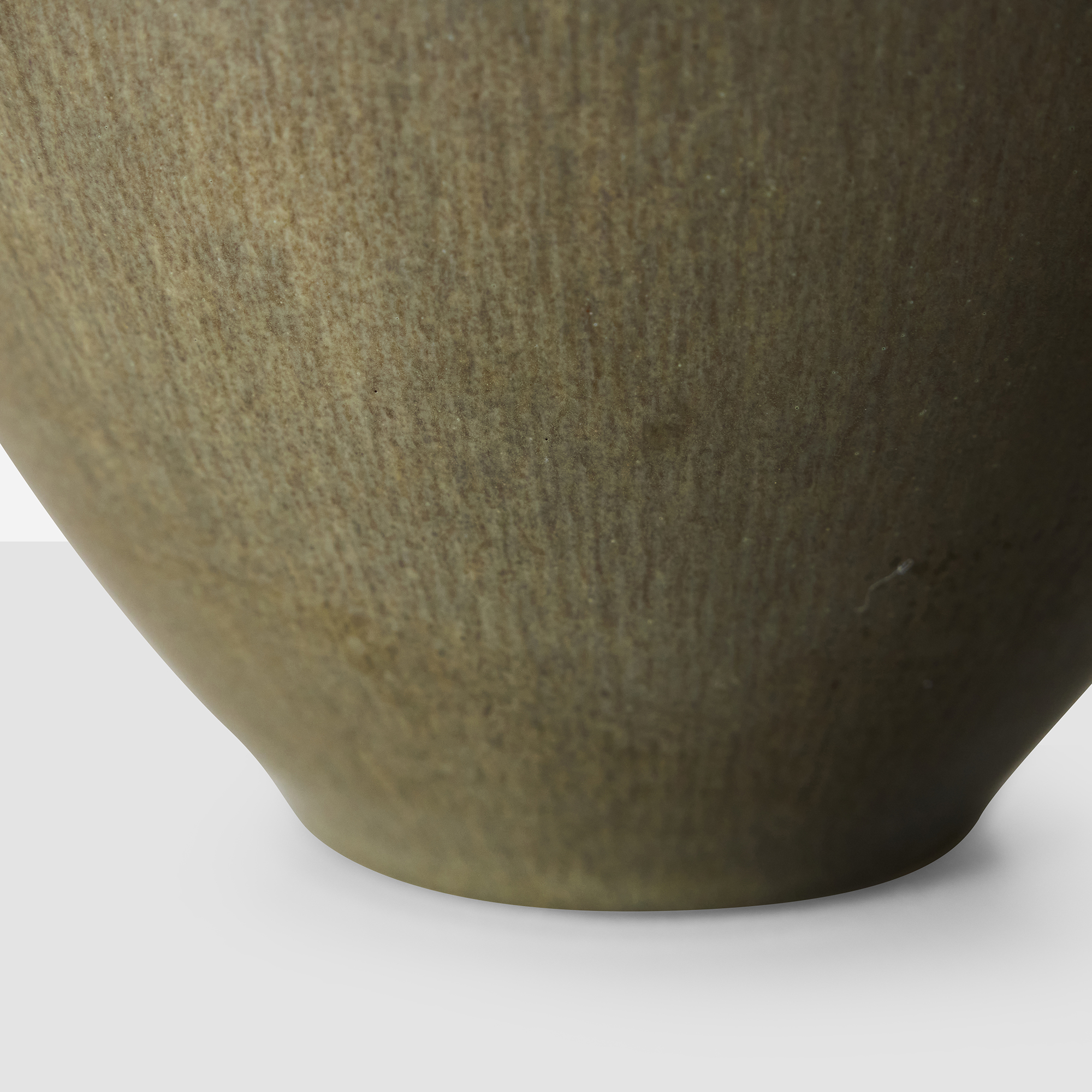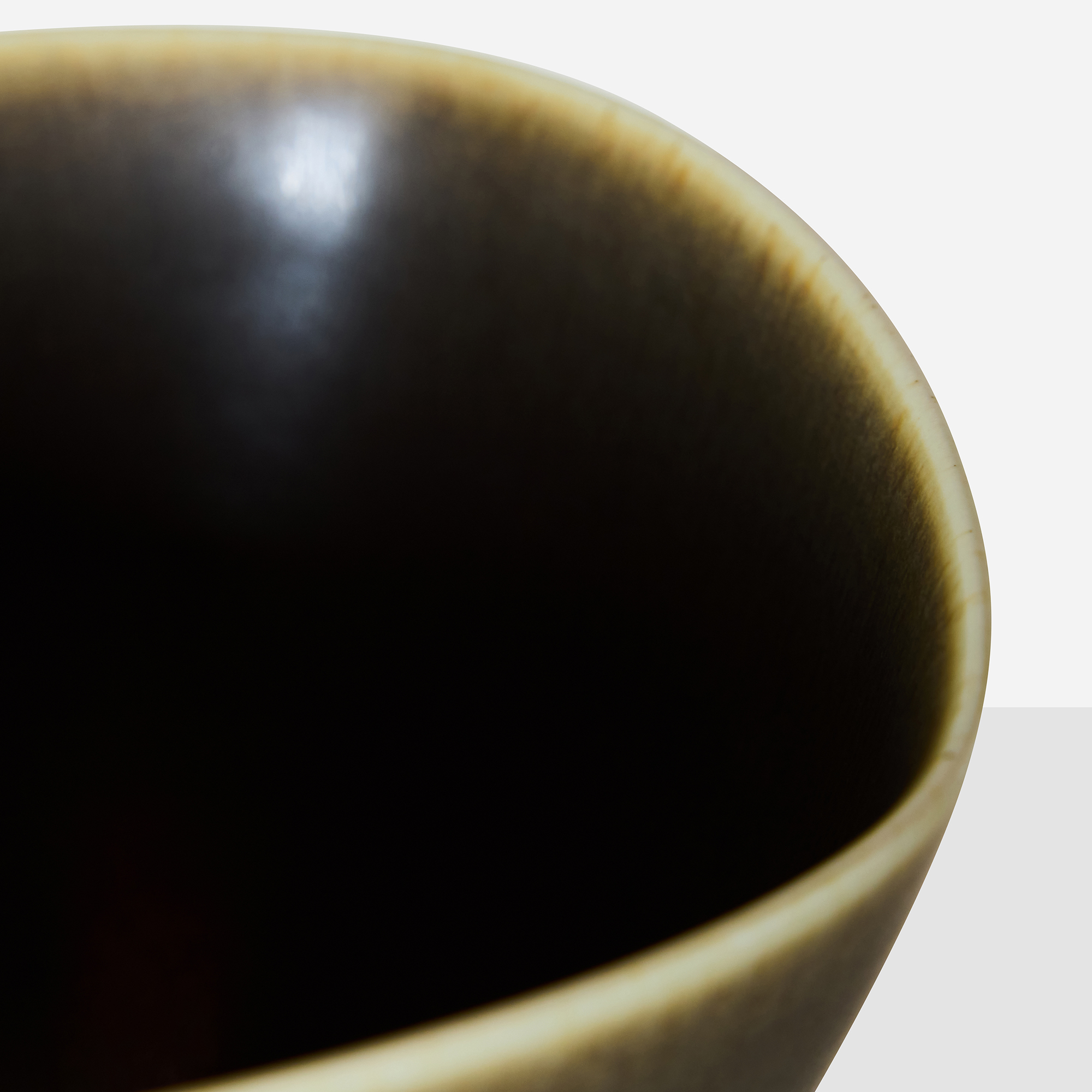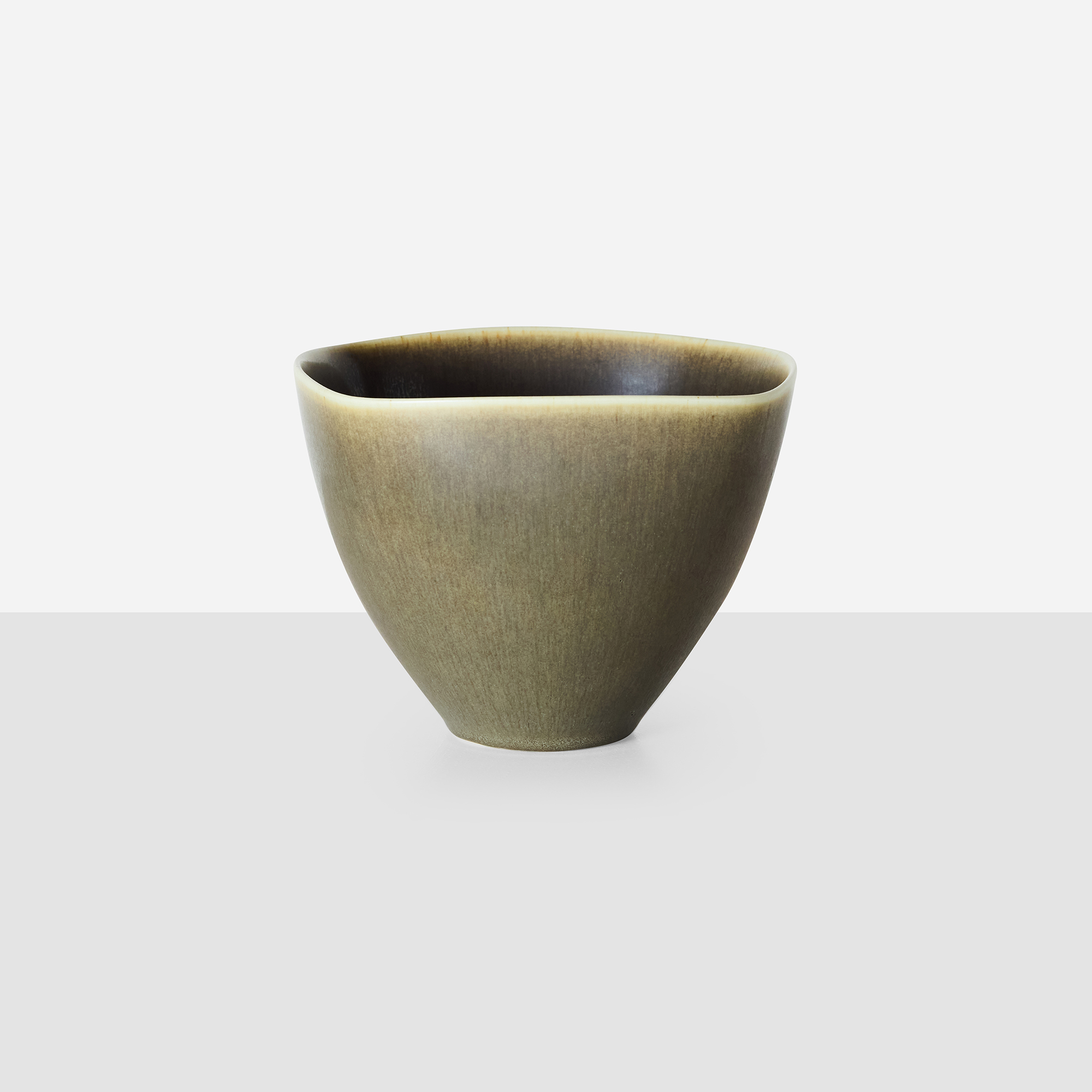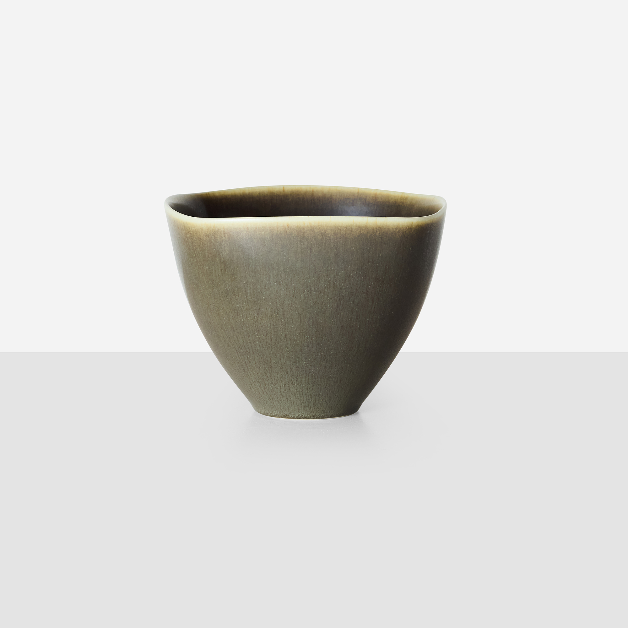 Footed square bowl with olive-brown hare’s fur glaze by Per Linnemann-Schmidt for Palshus. Signed to base “PALSHUS DENMARK PLS”.