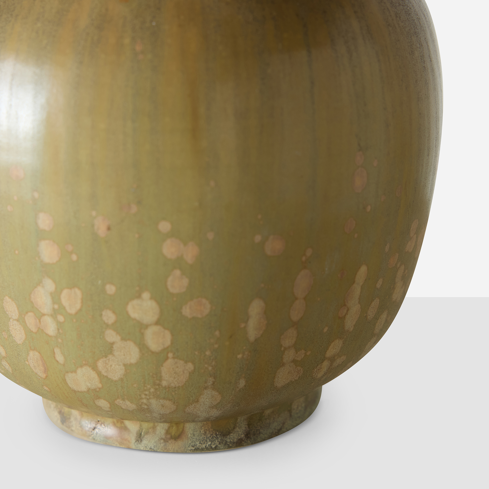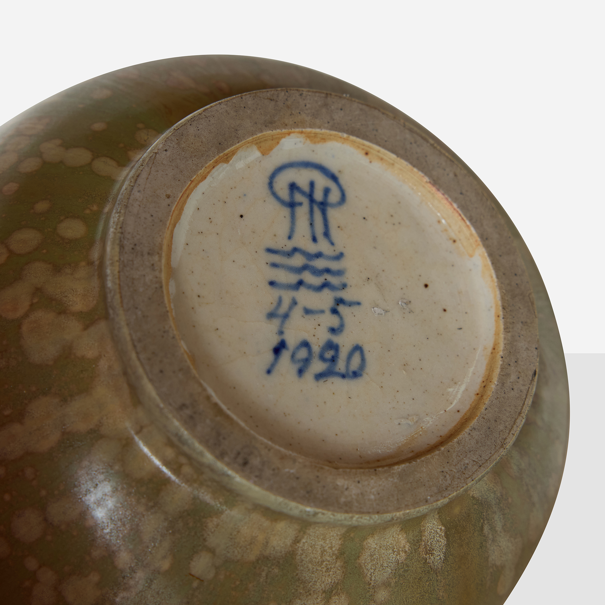 Rounded vase with greenish flecked glaze. Made during Nordström’s time at the Danish factory. Signed PN with Royal Copenhagen wave mark and 1920 date on base.