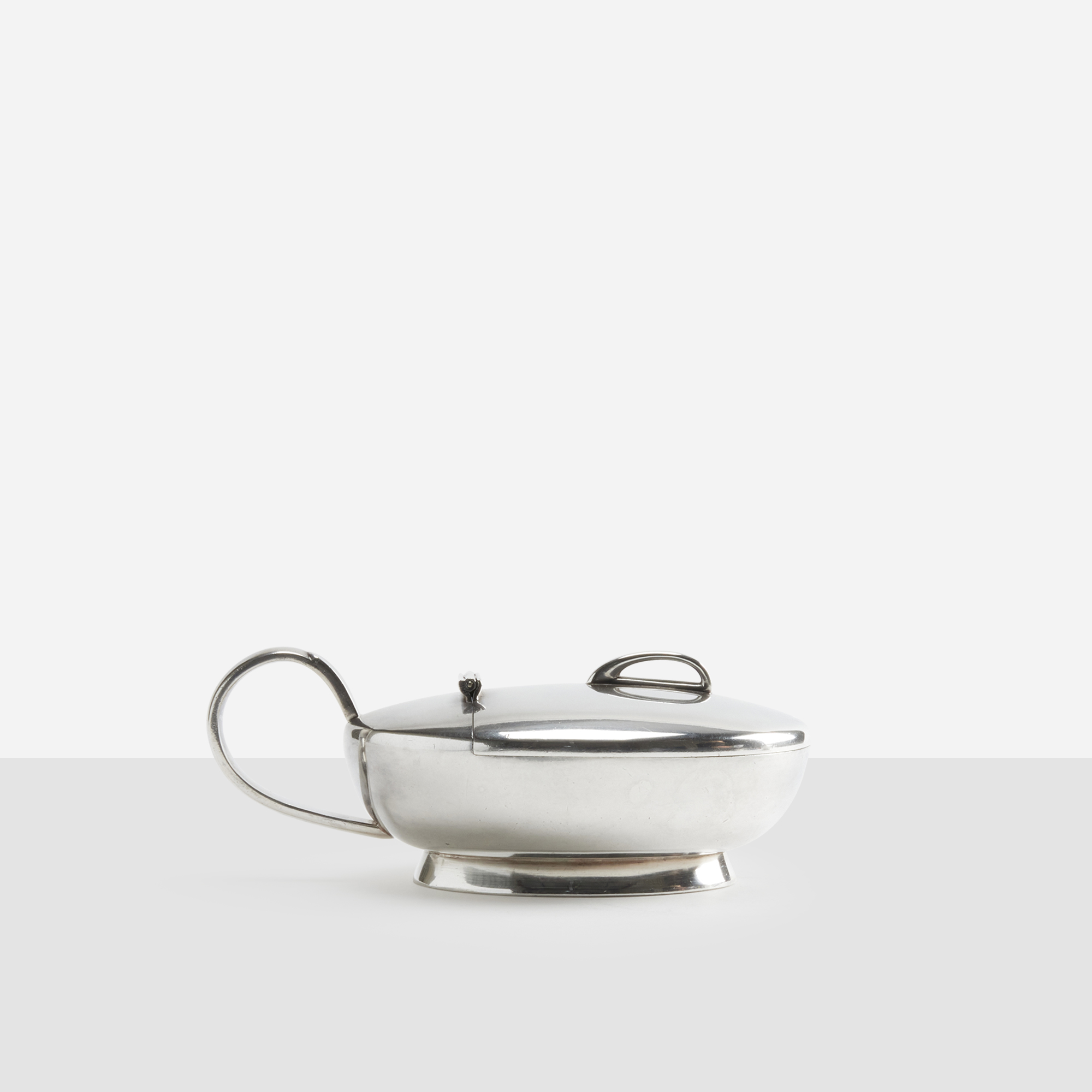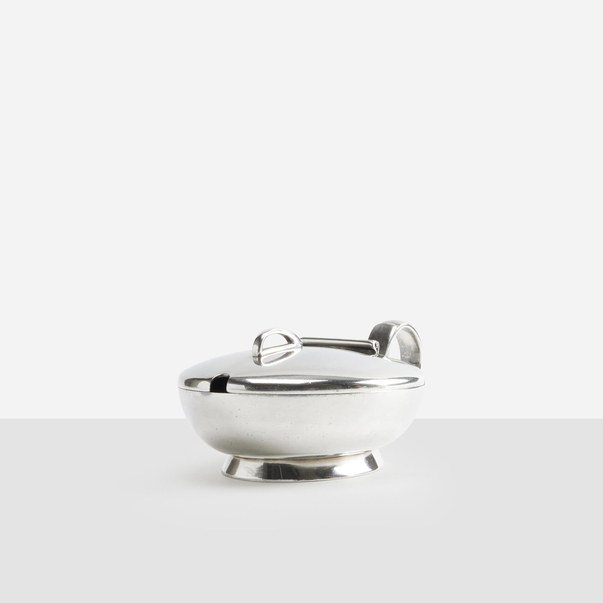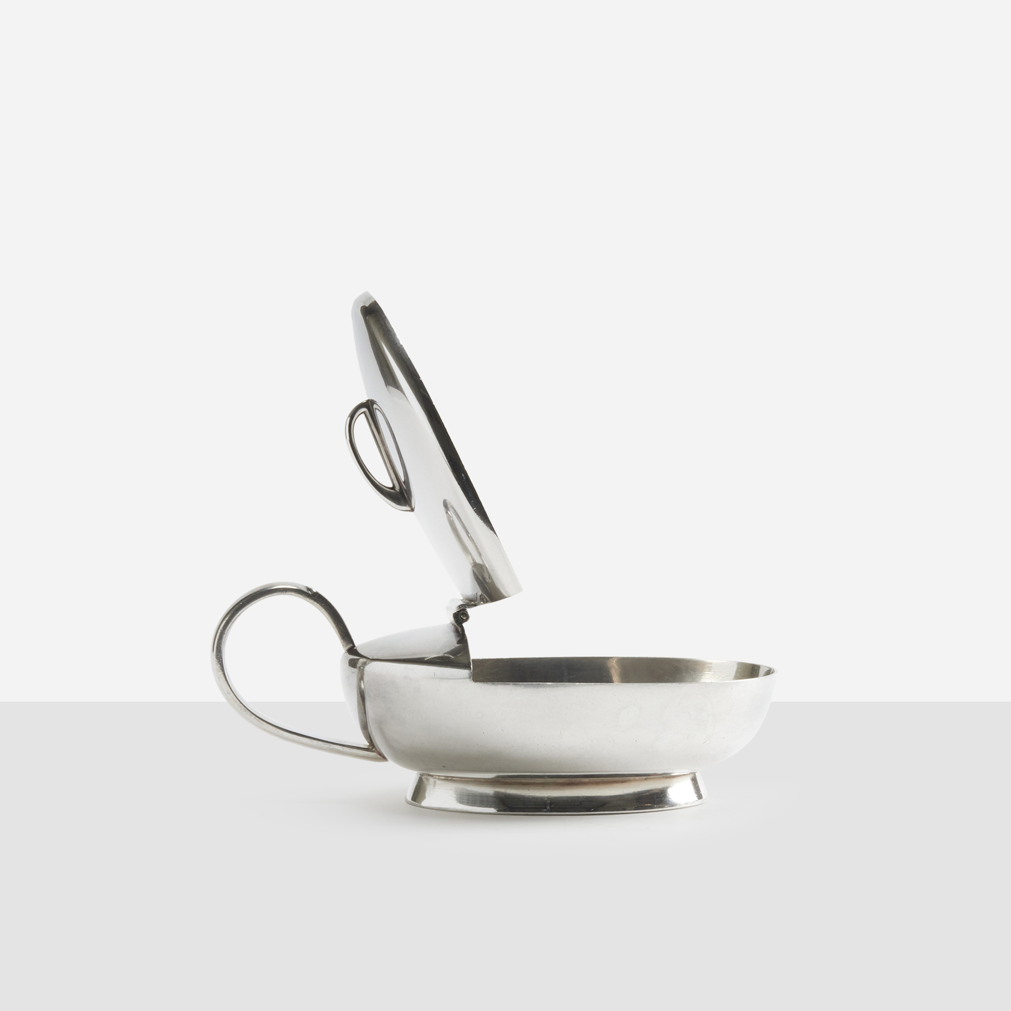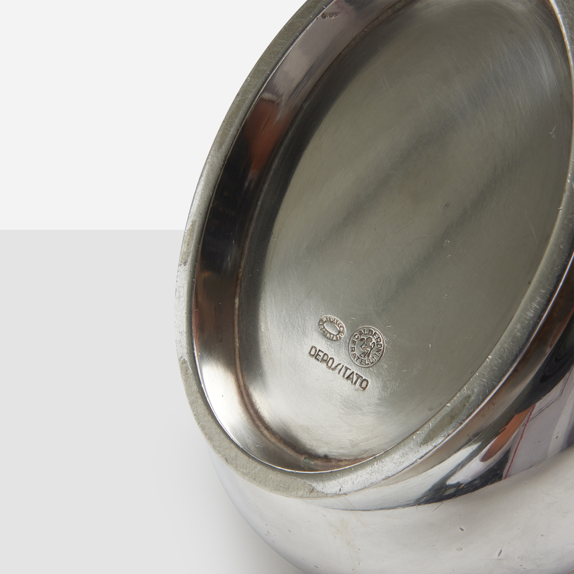 Both pieces rest on pedestal bases and feature Ponti’s characteristic modernist restraint—clean lines with sculptural handles. The creamer’s integrated hinged lid mechanism reflects the designer’s attention to functional elegance, typical of luxury hotel service pieces from this era.