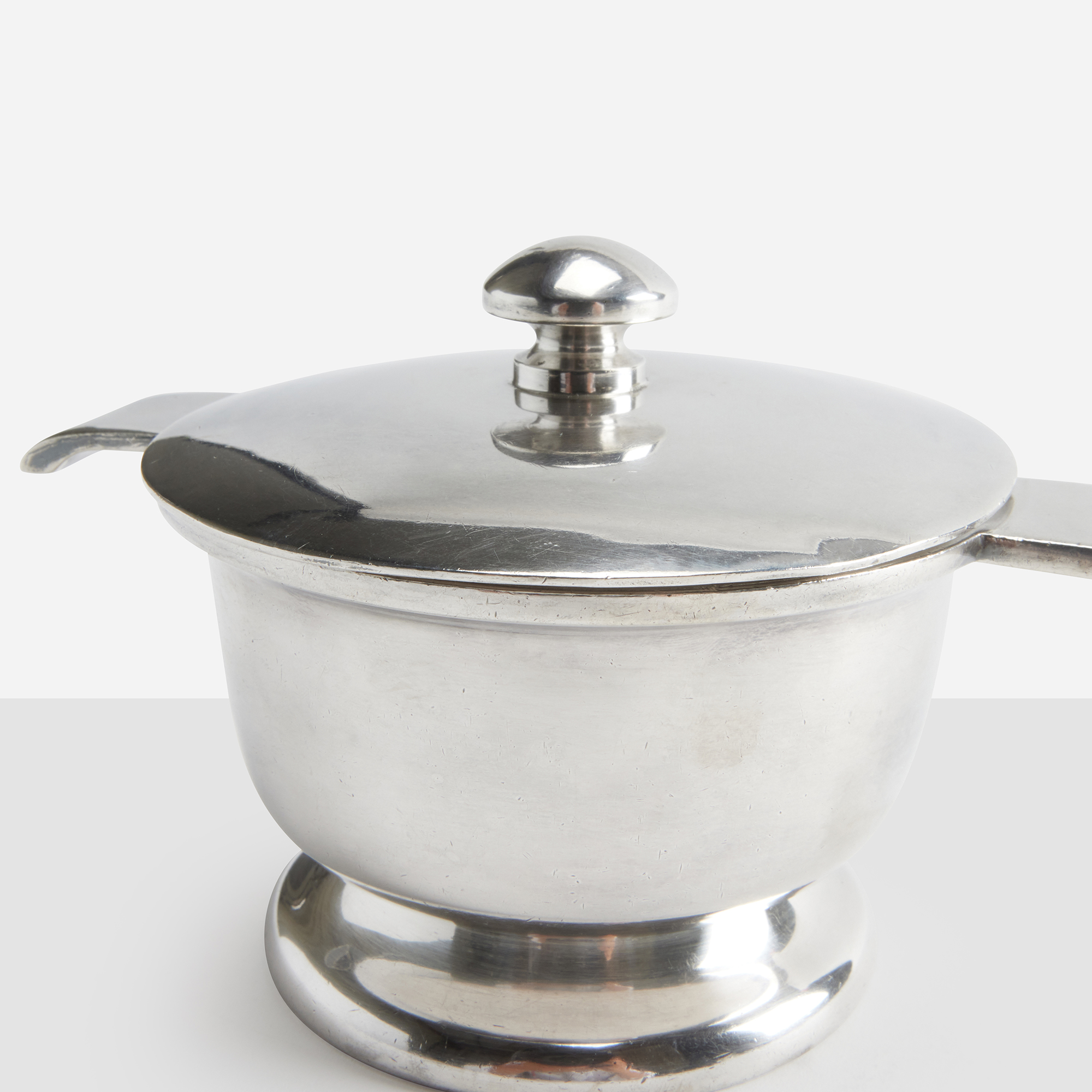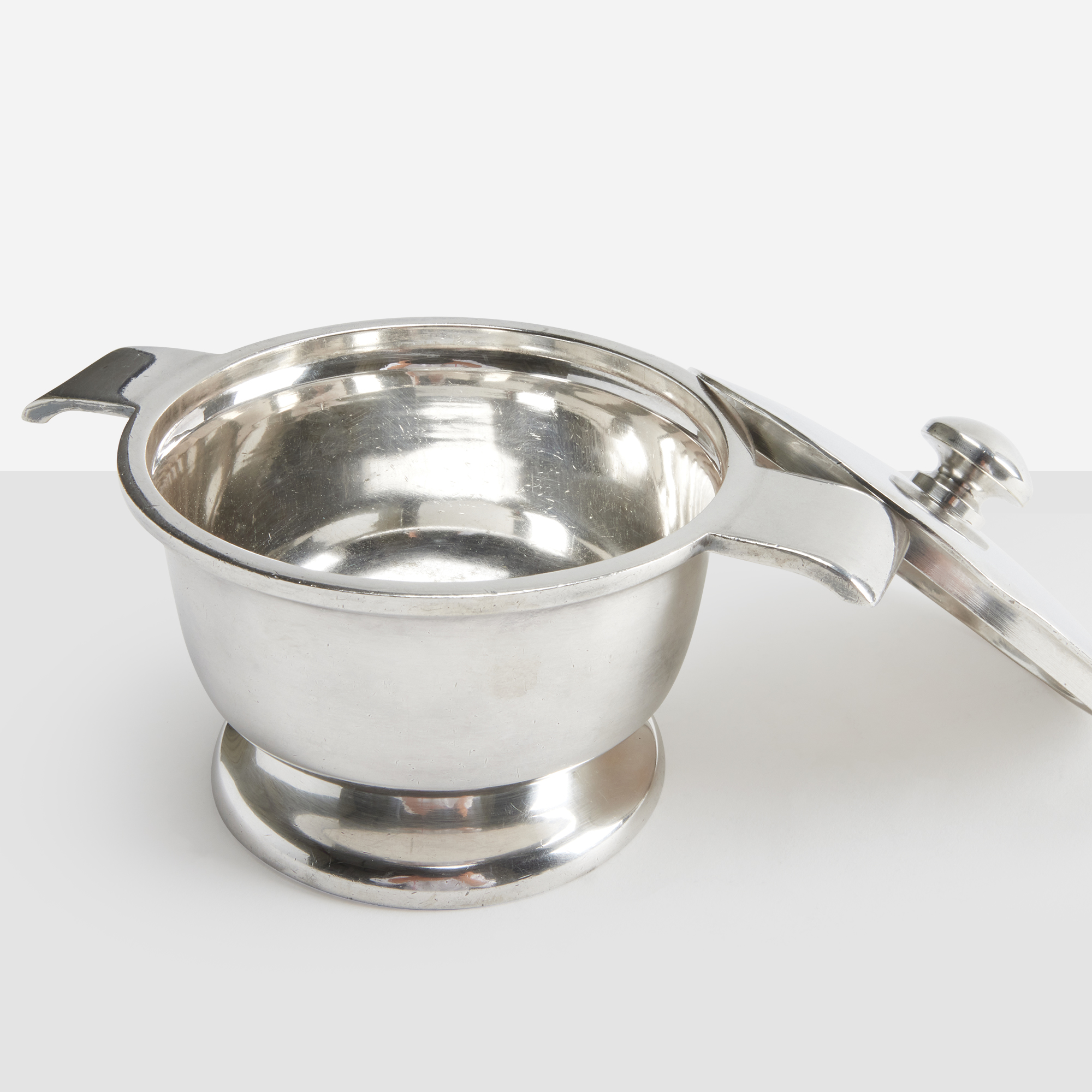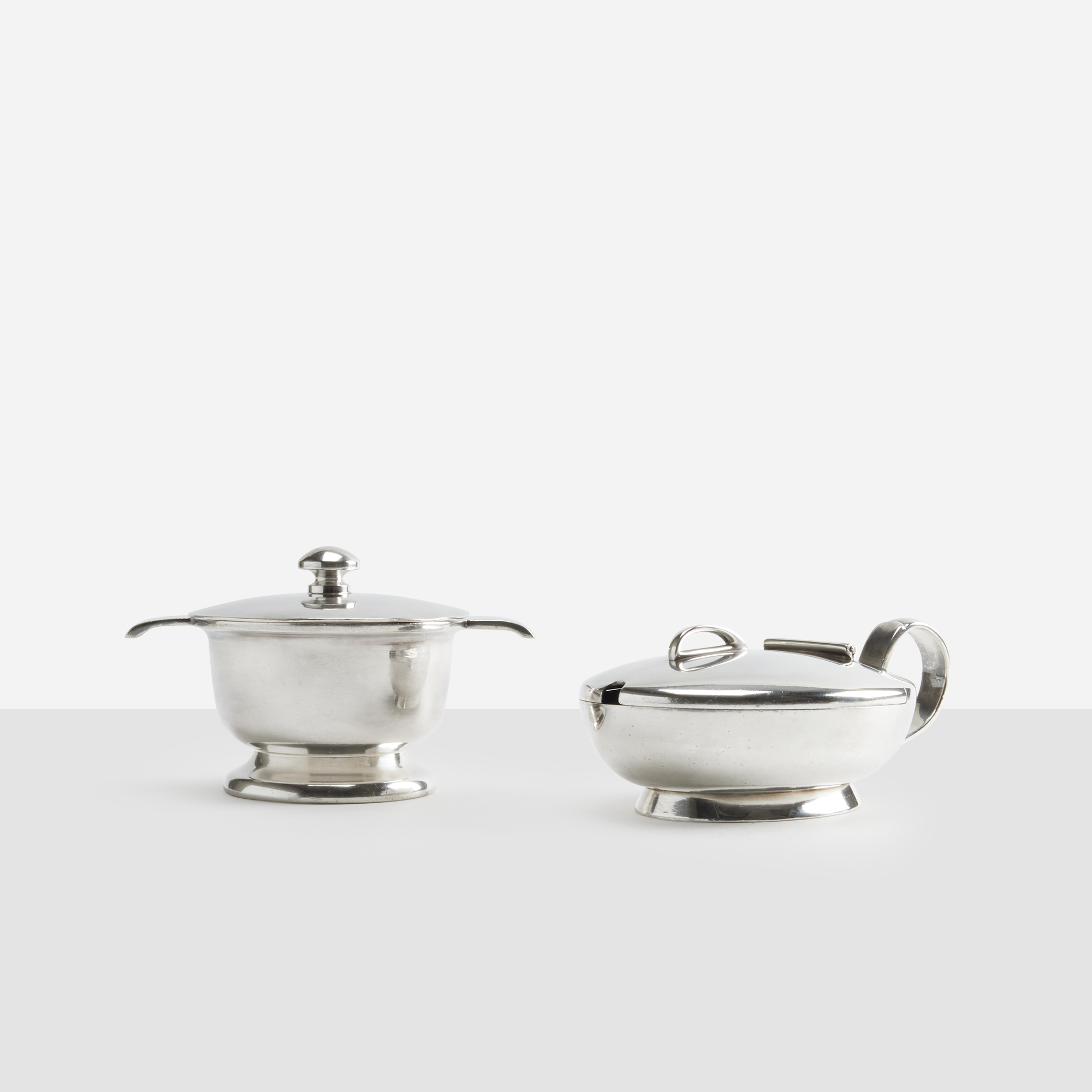 A pair of silver-plated alpacca vessels designed by Gio Ponti for Fratelli Calderoni, comprising a footed covered sugar bowl and creamer with hinged lid.