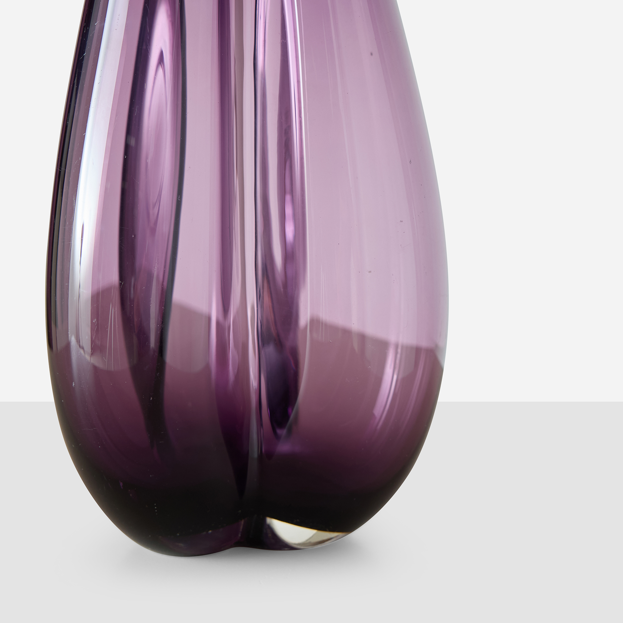 Mouth-blown amethyst glass vase with distinctive three-lobed trefoil form. Part of a series produced in several sizes from 1955. Etched “Holmegaard 1955″ on base. A few small dings and light scratches from use, no cracks or significant damage.