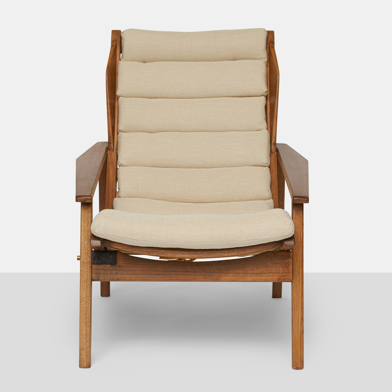 A very rare pair of oak armchairs by Gio Ponti retaining the original Cassina label. The chairs are a variation on model #811 and were made in 1957. The chair can be adjusted to 5 different reclining position. The linen covered cushions are held onto the frame with Pirelli webbing.