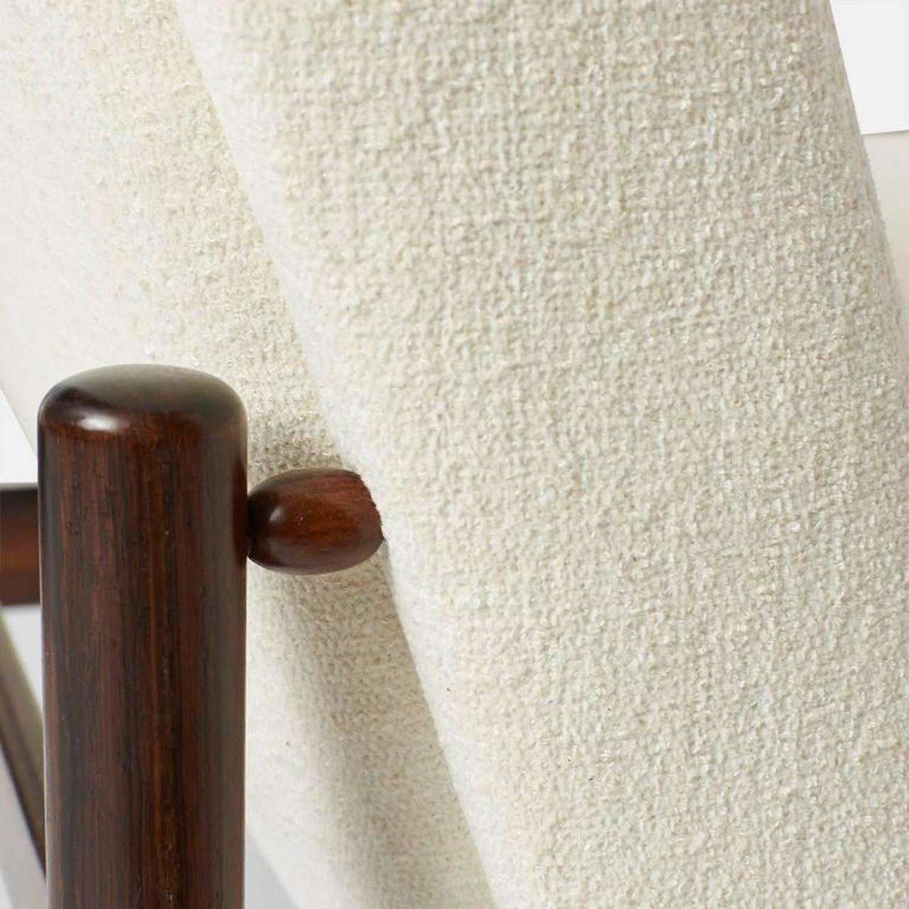 A pair of Vivi lounge chairs by Sergio Rodrigues in jacaranda wood and upholstered in a luxurious soft wool bouclé from Holland & Sherry. Brazil, circa 1950s.