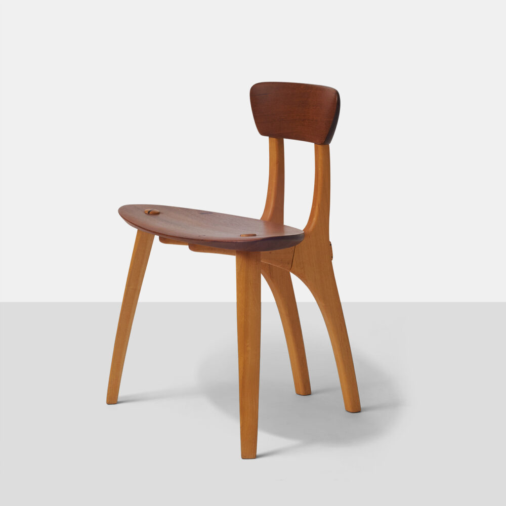 A unique side chair made of two species of Brazilian wood. The curved back and angle of the seat make this a very comfortable chair..