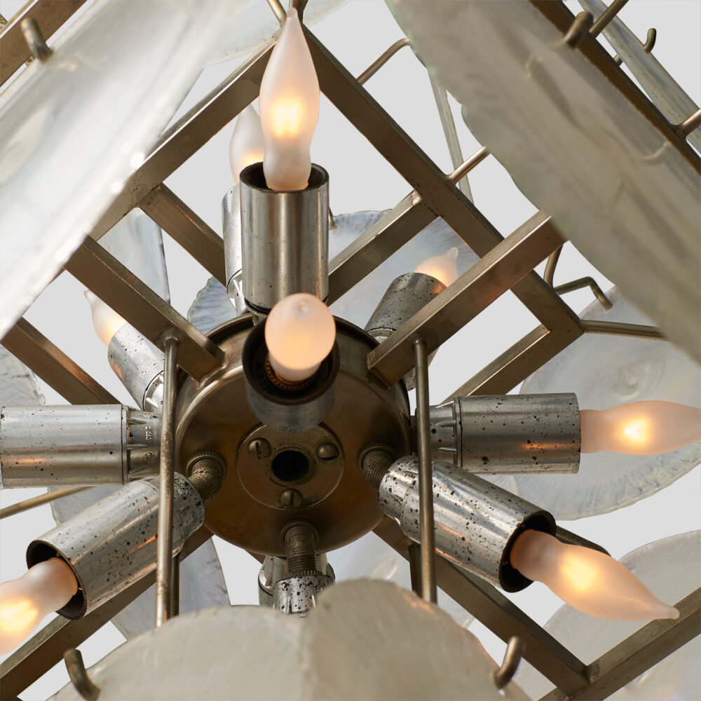 A large Vistosi chandelier made in Italy in the 1960s. The chandelier contains 68 Murano iridescent glass discs that conceal 12 European size candelabra base sockets.