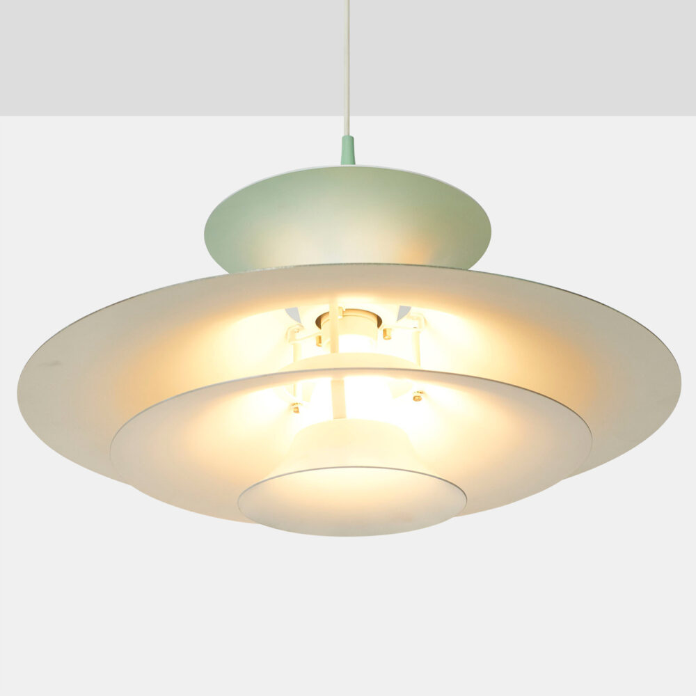 A pendant lamp designed by Eric Balslev and produced by Fog & Mørup in Denmark, c. 1970, made of enameled aluminum Painted on both sides.